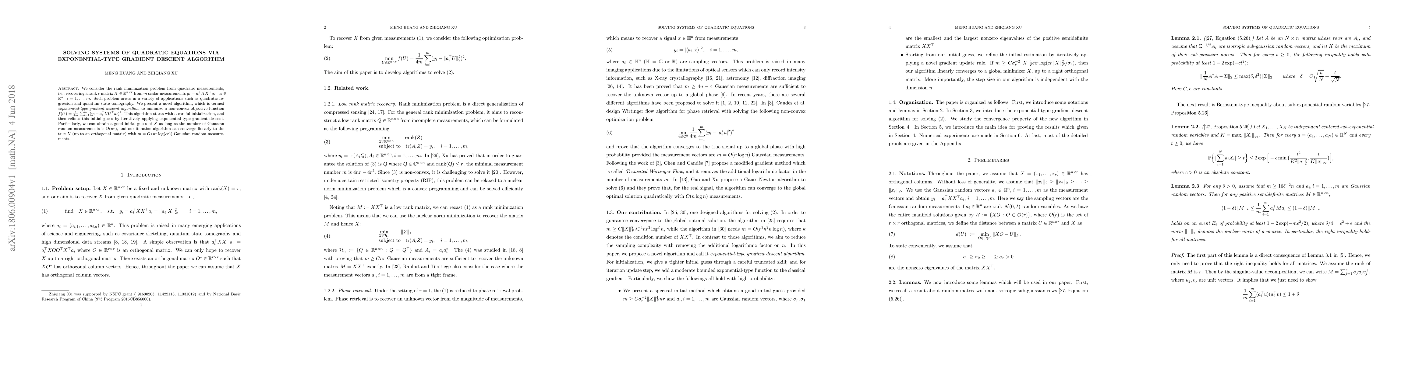 This paper introduces an exponential-type gradient descent algorithm to solve rank minimization problems from quadratic measurements, achieving linear convergence with $O(nr\log(cr))$ Gaussian random measurements. The algorithm starts with a good initial guess and iteratively refines it to recover the true matrix $X$.