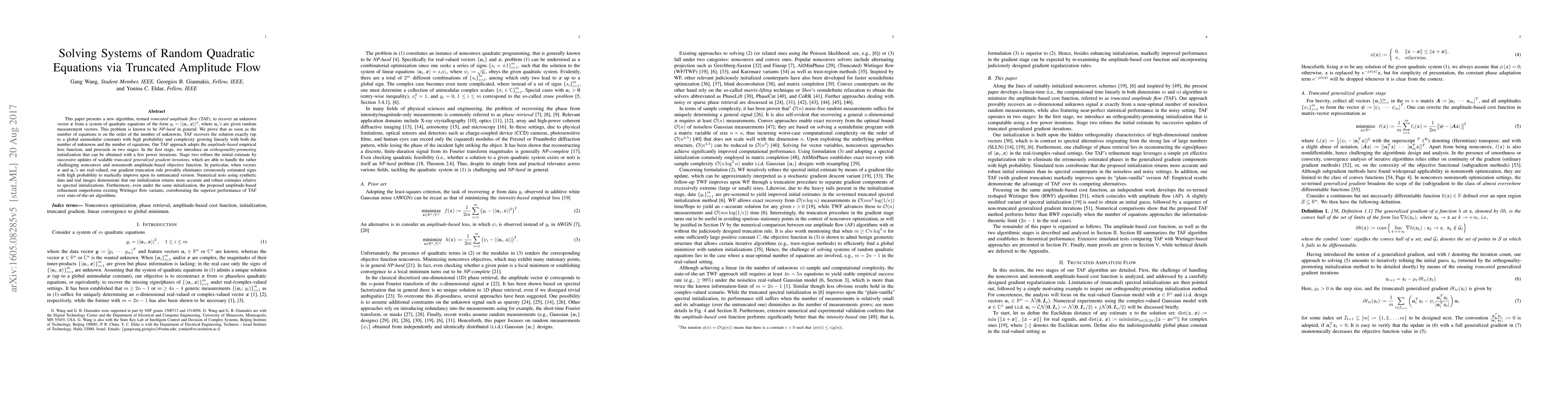 This paper introduces a new algorithm, truncated amplitude flow (TAF), to solve systems of random quadratic equations. TAF achieves exact recovery of the unknown vector with high probability and linear complexity, outperforming existing Wirtinger flow variants in numerical tests.