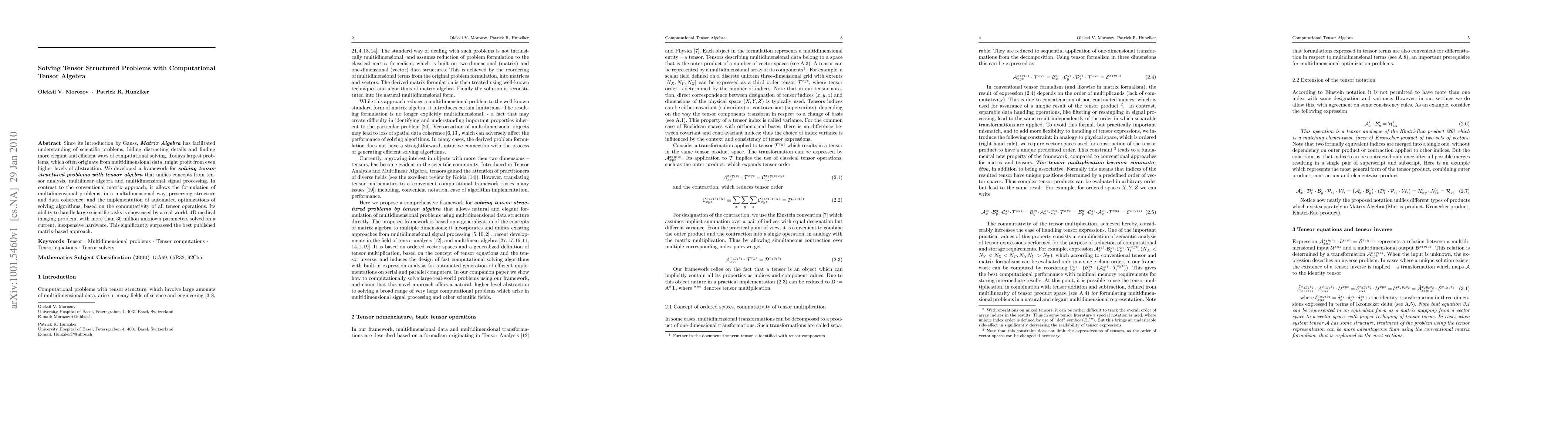 Since its introduction by Gauss, Matrix Algebra has facilitated understanding of scientific problems, hiding distracting details and finding more elegant and efficient ways of computational solving. Today's largest problems, which often originate from multidimensional data, might profit from even higher levels of abstraction. We developed a framework for solving tensor structured problems with tensor algebra that unifies concepts from tensor analysis, multilinear algebra and multidimensional signal processing. In contrast to the conventional matrix approach, it allows the formulation of multidimensional problems, in a multidimensional way, preserving structure and data coherence; and the implementation of automated optimizations of solving algorithms, based on the commutativity of all tensor operations. Its ability to handle large scientific tasks is showcased by a real-world, 4D medical imaging problem, with more than 30 million unknown parameters solved on a current, inexpensive hardware. This significantly surpassed the best published matrix-based approach.