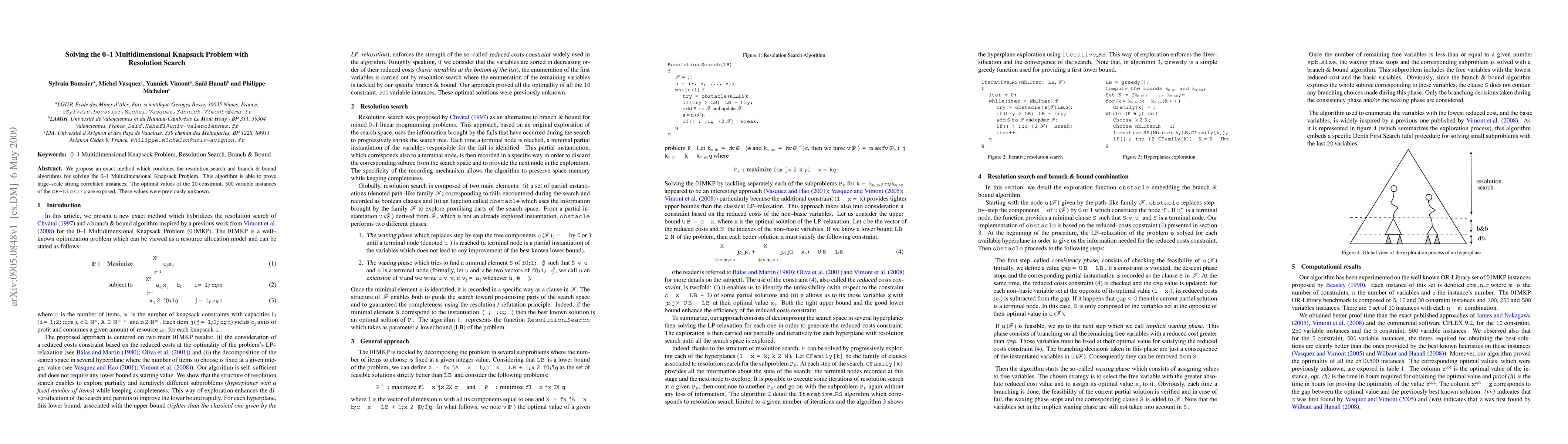 We propose an exact method which combines the resolution search and branch & bound algorithms for solving the 0?1 Multidimensional Knapsack Problem. This algorithm is able to prove large?scale strong correlated instances. The optimal values of the 10 constraint, 500 variable instances of the OR-Library are exposed. These values were previously unknown.