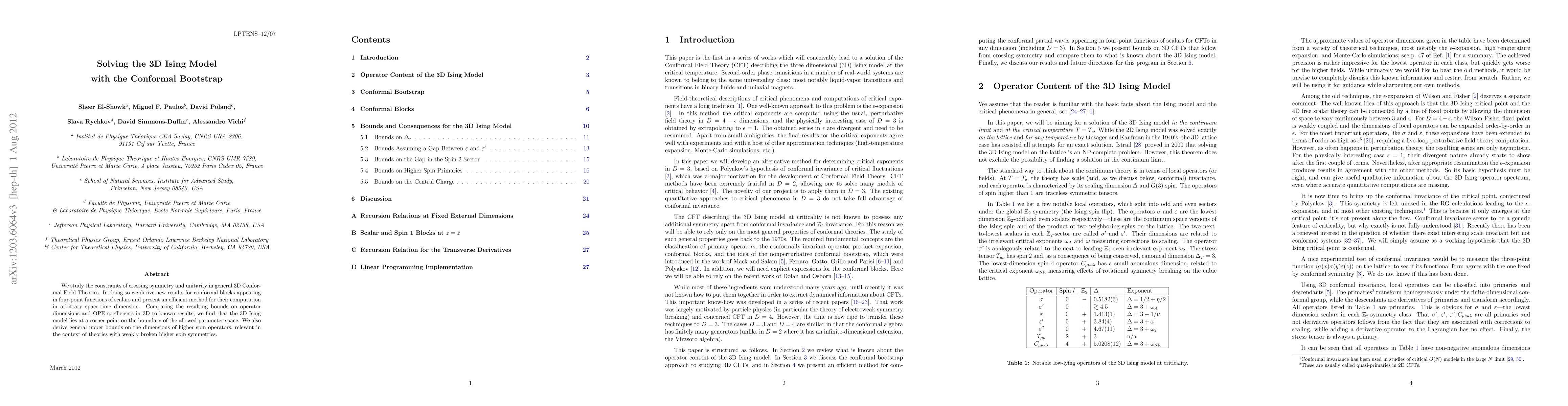This paper explores the 3D Ising model using the conformal bootstrap method, deriving new results for conformal blocks in 3D Conformal Field Theories. It reveals that the 3D Ising model occupies a critical boundary point in the allowed parameter space, thereby providing insights into higher spin operators in theories with weakly broken symmetries.