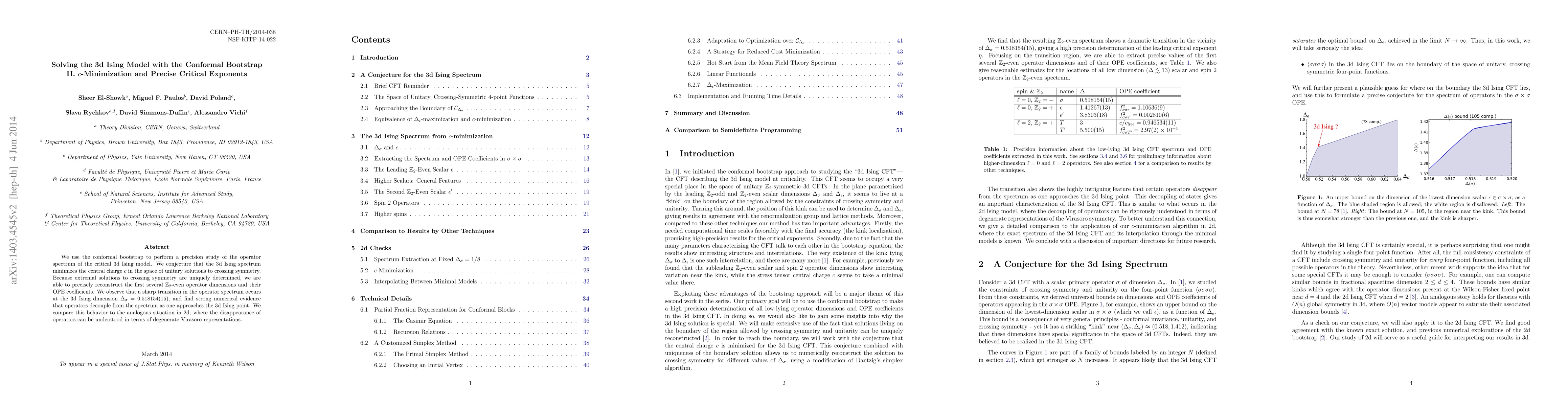 This paper employs the conformal bootstrap to study the operator spectrum of the critical 3d Ising model, hypothesizing that the spectrum minimizes the central charge c. The study precisely reconstructs operator dimensions and OPE coefficients, revealing a sharp transition at Delta_sigma=0.518154(15) and suggesting operator decoupling near the 3d Ising point, analogous to the 2d case.