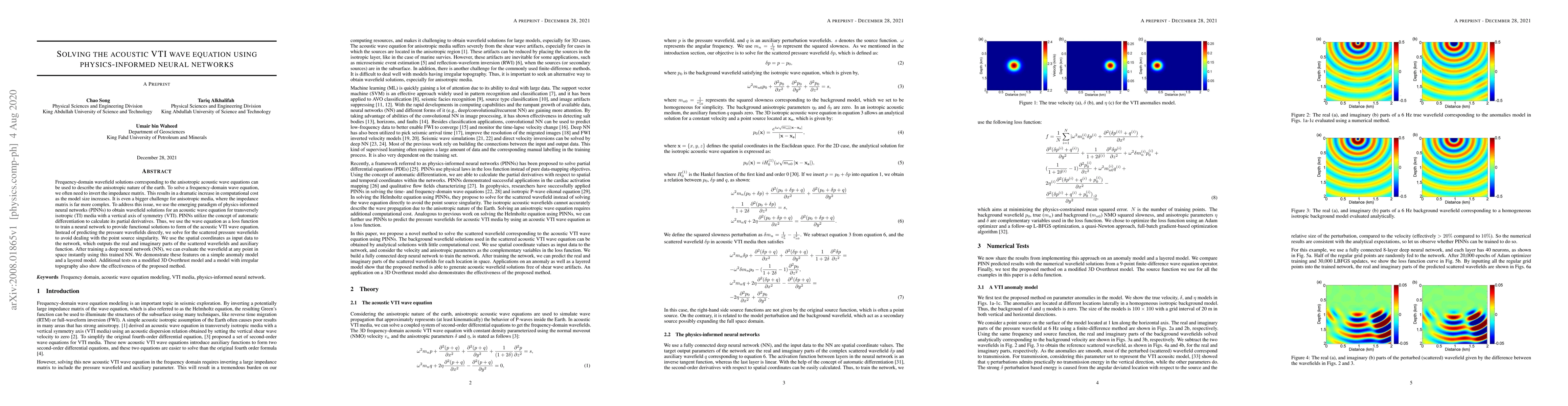 This paper proposes using physics-informed neural networks (PINNs) to solve the acoustic VTI wave equation for transversely isotropic media with a vertical axis of symmetry, addressing the computational challenges of inverting complex impedance matrices. The method trains a neural network with the wave equation as a loss function, providing efficient and accurate wavefield solutions for scattered pressure fields.