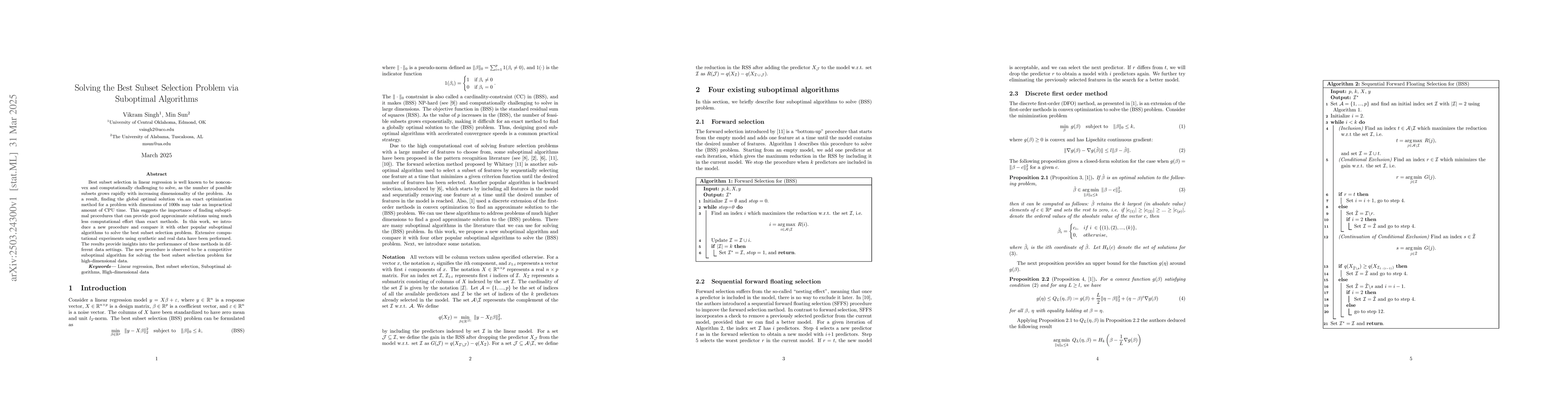 The paper introduces a new procedure for solving the best subset selection problem in linear regression using suboptimal algorithms and compares it with existing popular suboptimal algorithms through extensive computational experiments on synthetic and real datasets.