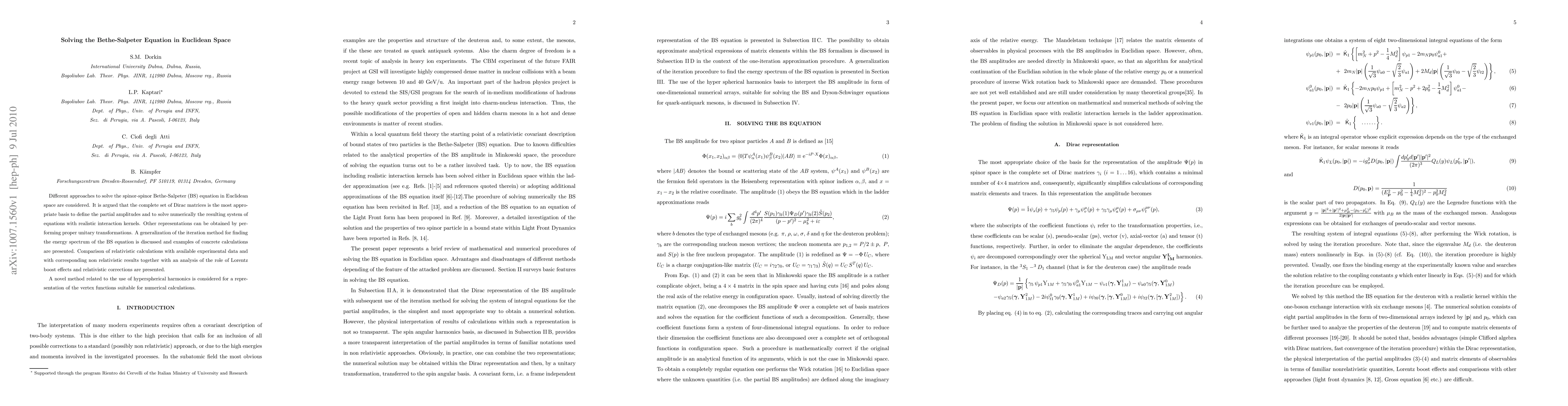 This paper explores various methods to solve the spinor-spinor Bethe-Salpeter equation in Euclidean space, advocating for the use of Dirac matrices as the optimal basis. It also introduces a novel hyperspherical harmonics approach for numerical calculations and compares relativistic results with experimental data and non-relativistic approximations.