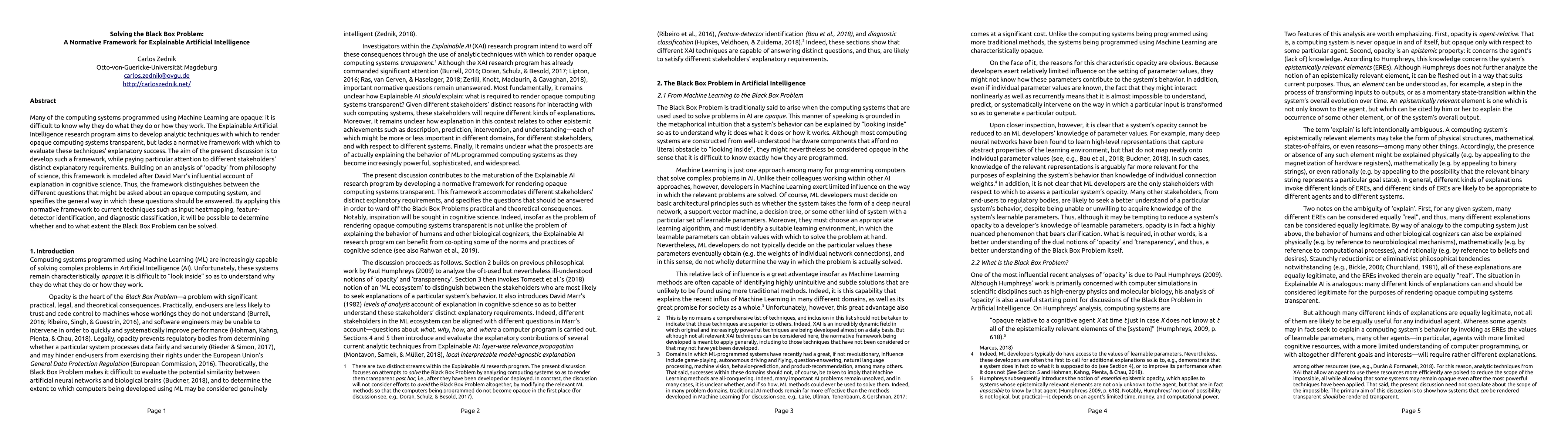 Many of the computing systems programmed using Machine Learning are opaque: it is difficult to know why they do what they do or how they work. The Explainable Artificial Intelligence research program aims to develop analytic techniques with which to render opaque computing systems transparent, but lacks a normative framework with which to evaluate these techniques' explanatory success. The aim of the present discussion is to develop such a framework, while paying particular attention to different stakeholders' distinct explanatory requirements. Building on an analysis of 'opacity' from philosophy of science, this framework is modeled after David Marr's influential account of explanation in cognitive science. Thus, the framework distinguishes between the different questions that might be asked about an opaque computing system, and specifies the general way in which these questions should be answered. By applying this normative framework to current techniques such as input heatmapping, feature-detector identification, and diagnostic classification, it will be possible to determine whether and to what extent the Black Box Problem can be solved.