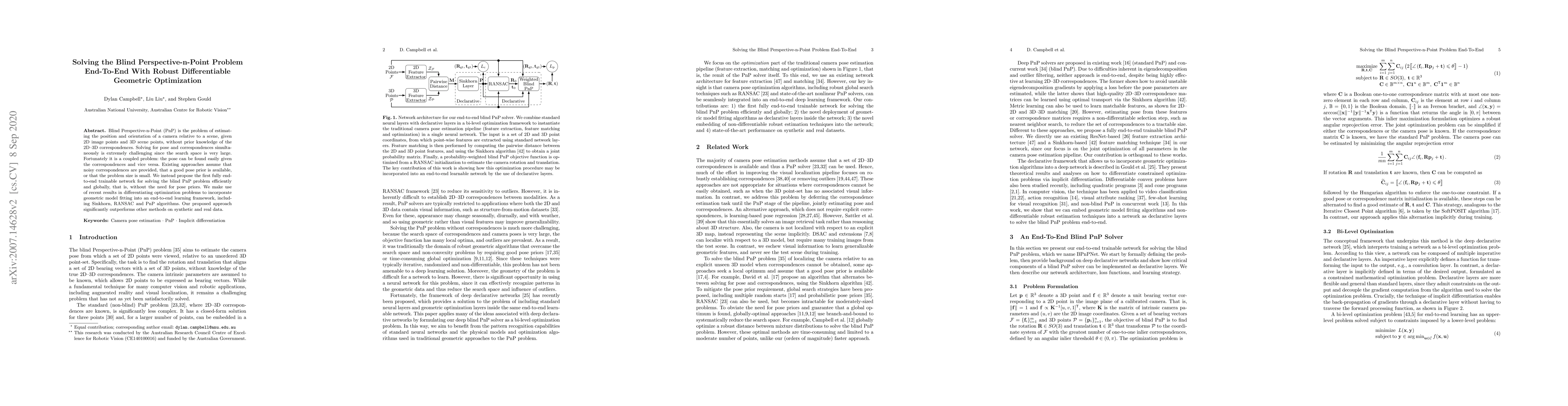This paper proposes an end-to-end trainable neural network to solve the blind Perspective-n-Point (PnP) problem, which estimates camera pose without prior knowledge of 2D-3D correspondences. The method integrates differentiable geometric optimization techniques to achieve global and efficient solutions, outperforming existing methods on both synthetic and real datasets.