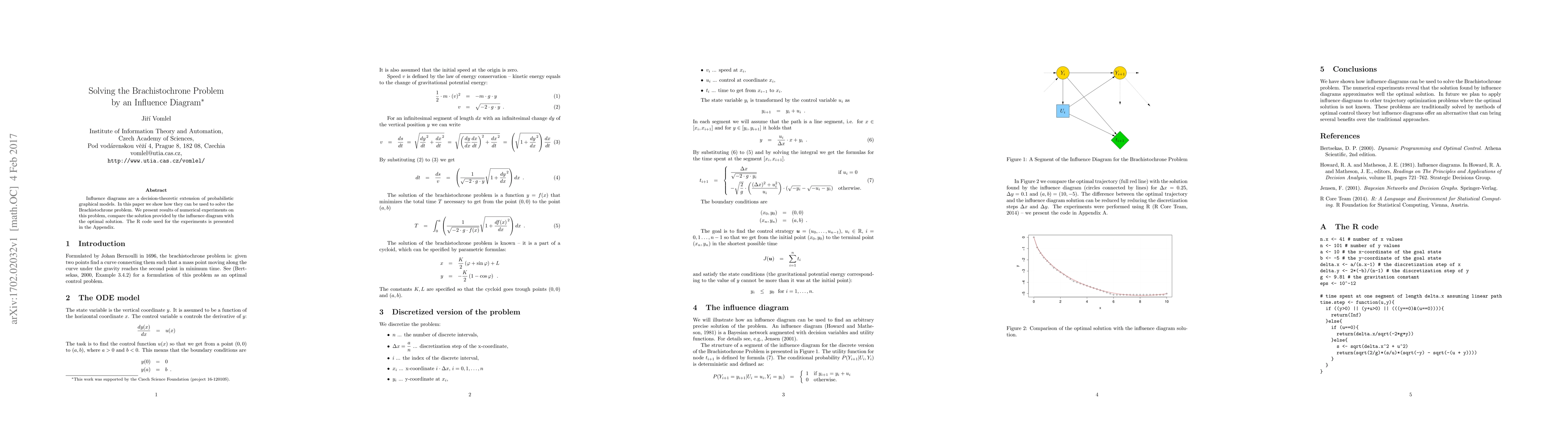 Influence diagrams are a decision-theoretic extension of probabilistic graphical models. In this paper we show how they can be used to solve the Brachistochrone problem. We present results of numerical experiments on this problem, compare the solution provided by the influence diagram with the optimal solution. The R code used for the experiments is presented in the Appendix.