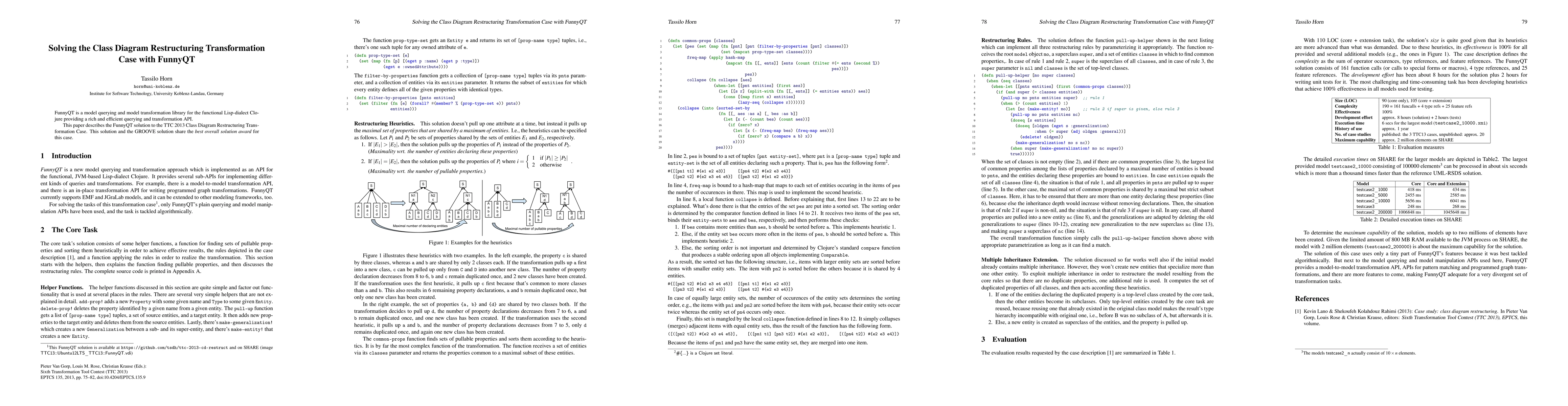 This paper presents FunnyQT, a model querying and transformation library for Clojure, which was used to solve the TTC 2013 Class Diagram Restructuring Transformation Case, winning the best overall solution award alongside the GROOVE solution.
