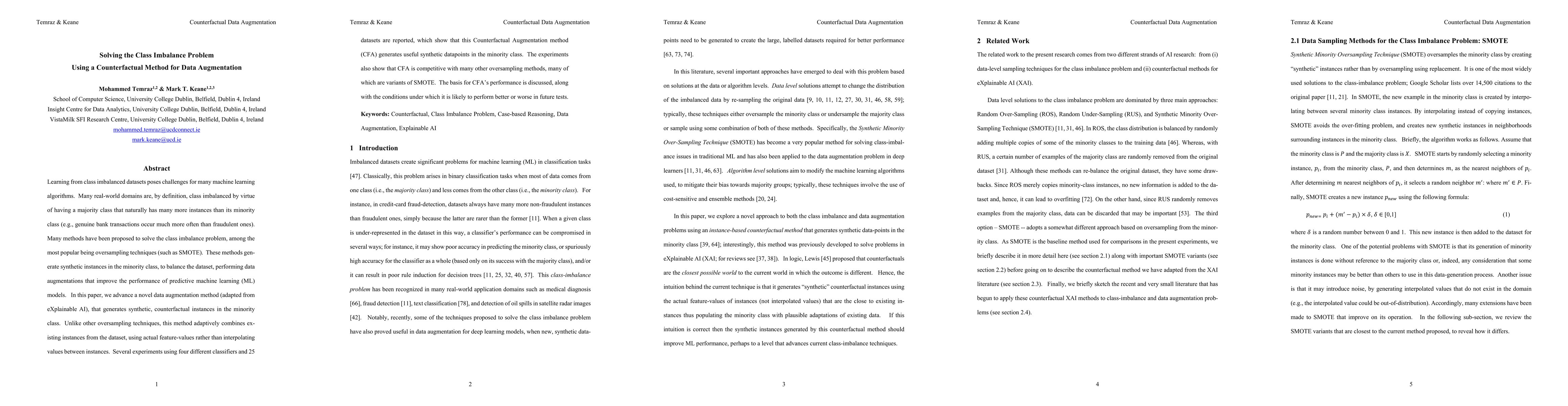This paper proposes a novel data augmentation method called Counterfactual Augmentation (CFA) to address class imbalance in datasets by generating synthetic instances in the minority class through adaptive combinations of existing instances. Experiments show CFA is competitive with other oversampling methods, particularly variants of SMOTE, and discuss its performance basis and conditions for optimal effectiveness.