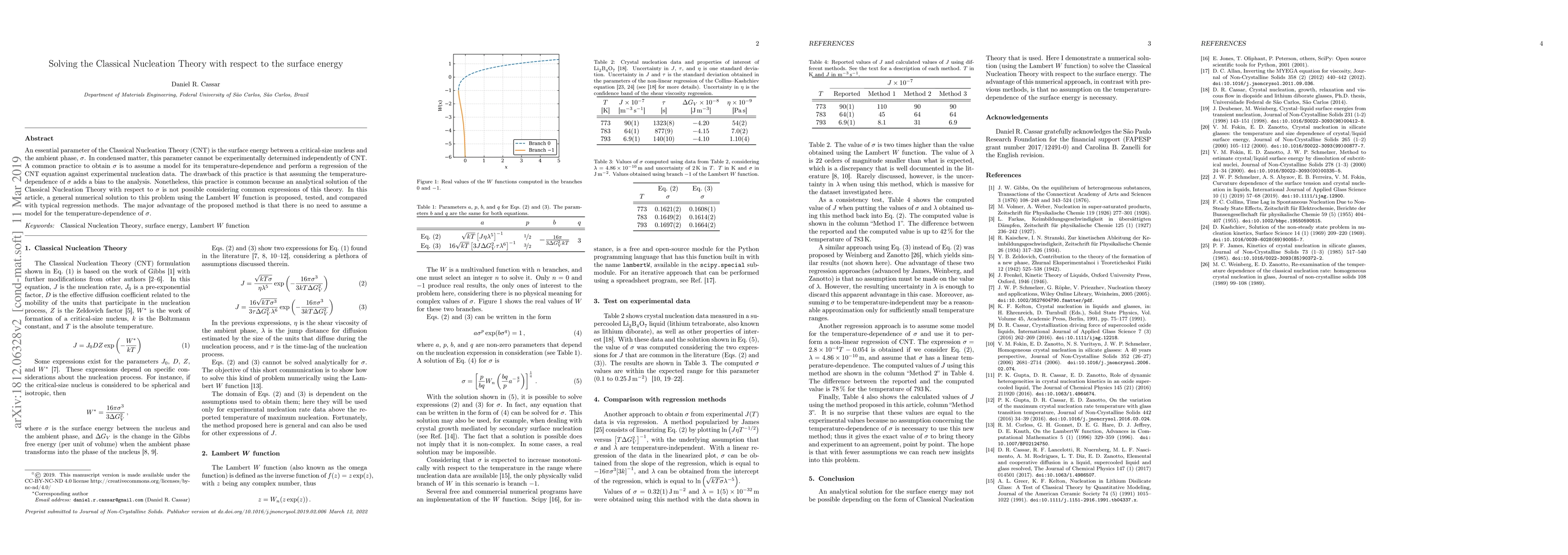 An essential parameter of the Classical Nucleation Theory (CNT) is the surface energy between a critical-size nucleus and the ambient phase, $\sigma$. In condensed matter, this parameter cannot be experimentally determined independently of CNT. A common practice to obtain $\sigma$ is to assume a model for its temperature-dependence and perform a regression of the CNT equation against experimental nucleation data. The drawback of this practice is that assuming the temperature-dependence of $\sigma$ adds a bias to the analysis. Nonetheless, this practice is common because an analytical solution of the Classical Nucleation Theory with respect to $\sigma$ is not possible considering common expressions of this theory. In this article, a general numerical solution to this problem using the Lambert $W$ function is proposed, tested, and compared with typical regression methods. The major advantage of the proposed method is that there is no need to assume a model for the temperature-dependence of $\sigma$.