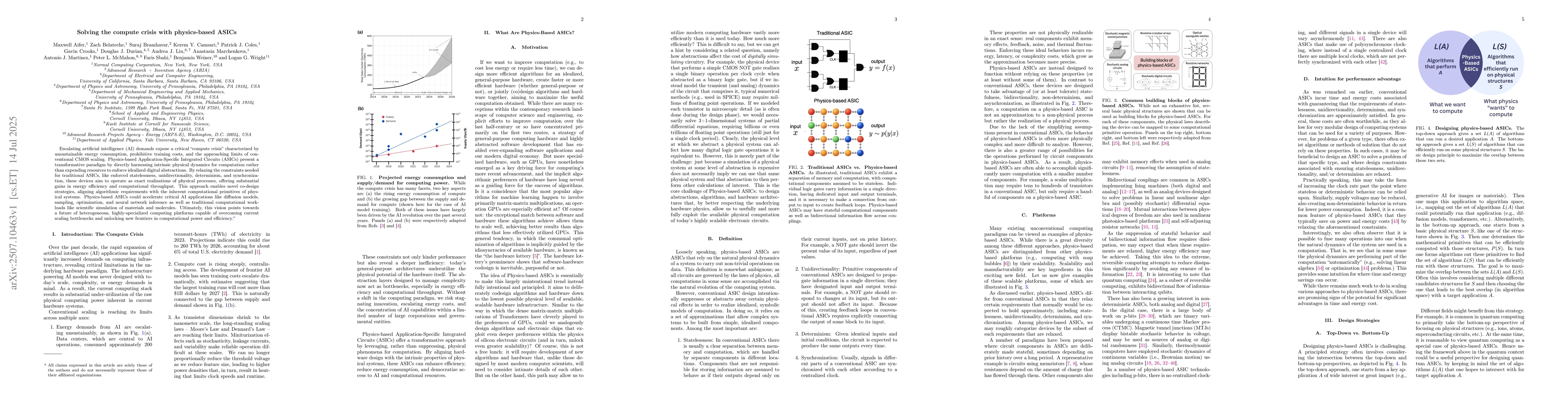 Escalating artificial intelligence (AI) demands expose a critical "compute crisis" characterized by unsustainable energy consumption, prohibitive training costs, and the approaching limits of conventional CMOS scaling. Physics-based Application-Specific Integrated Circuits (ASICs) present a transformative paradigm by directly harnessing intrinsic physical dynamics for computation rather than expending resources to enforce idealized digital abstractions. By relaxing the constraints needed for traditional ASICs, like enforced statelessness, unidirectionality, determinism, and synchronization, these devices aim to operate as exact realizations of physical processes, offering substantial gains in energy efficiency and computational throughput. This approach enables novel co-design strategies, aligning algorithmic requirements with the inherent computational primitives of physical systems. Physics-based ASICs could accelerate critical AI applications like diffusion models, sampling, optimization, and neural network inference as well as traditional computational workloads like scientific simulation of materials and molecules. Ultimately, this vision points towards a future of heterogeneous, highly-specialized computing platforms capable of overcoming current scaling bottlenecks and unlocking new frontiers in computational power and efficiency.