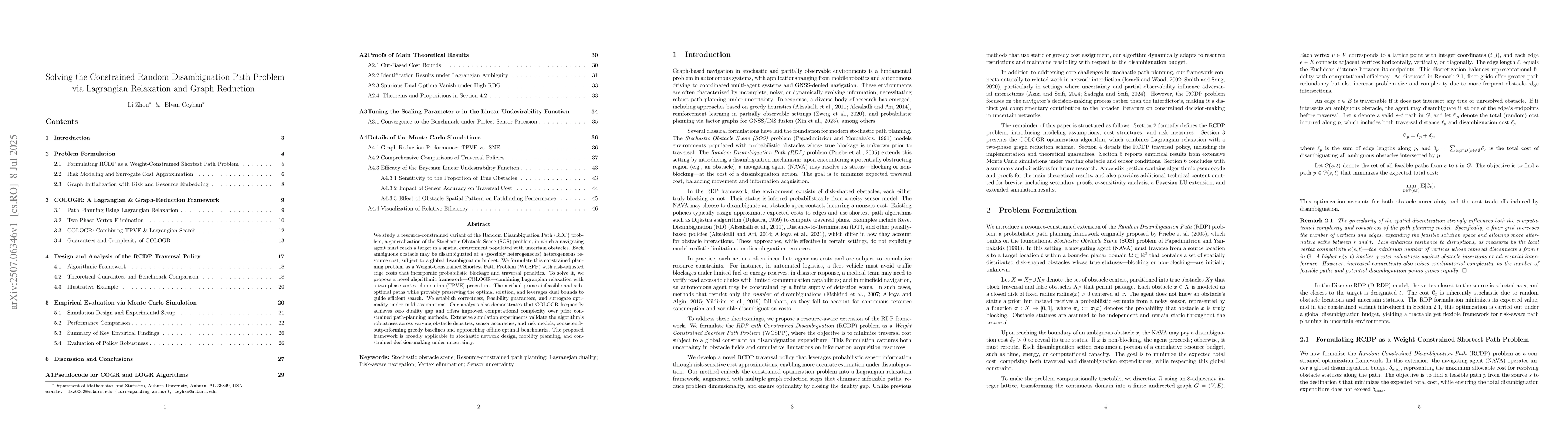 This research introduces COLOGR, a novel algorithmic framework combining Lagrangian relaxation and graph reduction to solve the constrained Random Disambiguation Path problem. It efficiently handles resource-constrained planning with probabilistic obstacles, outperforming baselines in simulations and offering improved complexity. The method has broad applications in stochastic network design and decision-making under uncertainty.