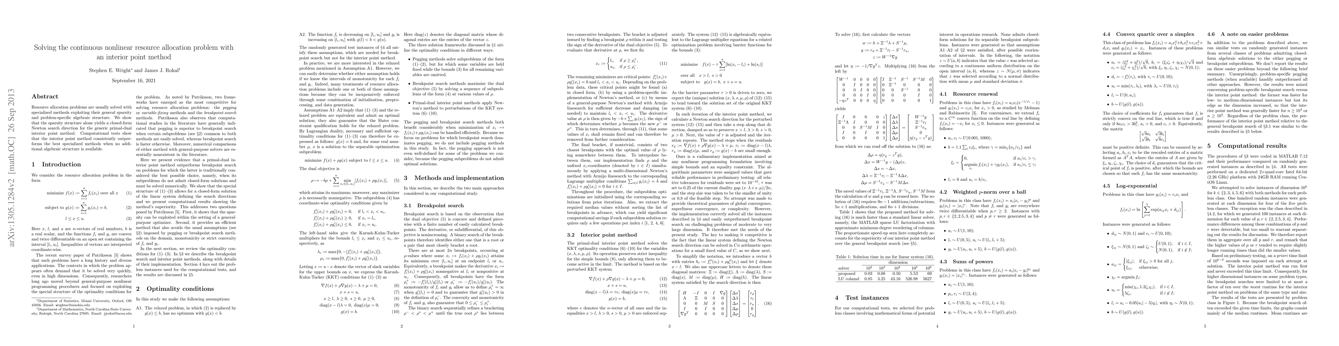 This paper proposes an interior point method for solving continuous nonlinear resource allocation problems, demonstrating that the method's sparsity structure provides a closed-form Newton search direction. Computational results indicate that this approach outperforms specialized methods when no additional algebraic structure is present.
