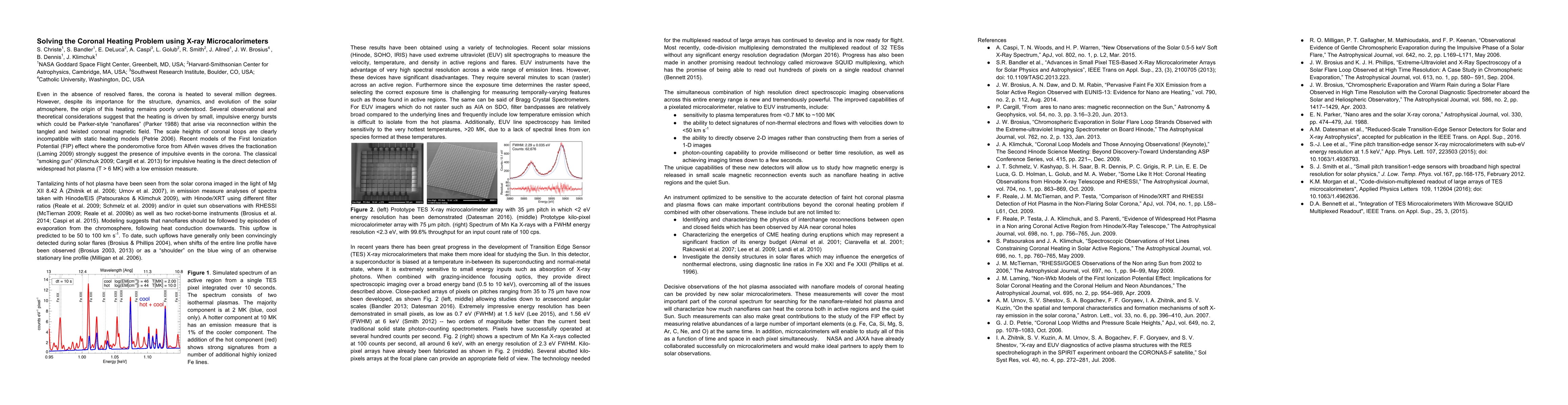 Even in the absence of resolved flares, the corona is heated to several million degrees. However, despite its importance for the structure, dynamics, and evolution of the solar atmosphere, the origin of this heating remains poorly understood. Several observational and theoretical considerations suggest that the heating is driven by small, impulsive energy bursts which could be Parker-style "nanoflares" (Parker 1988) that arise via reconnection within the tangled and twisted coronal magnetic field. The classical "smoking gun" (Klimchuk 2009; Cargill et al. 2013) for impulsive heating is the direct detection of widespread hot plasma (T > 6 MK) with a low emission measure. In recent years there has been great progress in the development of Transition Edge Sensor (TES) X-ray microcalorimeters that make them more ideal for studying the Sun. When combined with grazing-incidence focusing optics, they provide direct spectroscopic imaging over a broad energy band (0.5 to 10 keV) combined with extremely impressive energy resolution in small pixels, as low as 0.7 eV (FWHM) at 1.5 keV (Lee 2015), and 1.56 eV (FWHM) at 6 keV (Smith 2012), two orders of magnitude better than the current best traditional solid state photon-counting spectrometers. Decisive observations of the hot plasma associated with nanoflare models of coronal heating can be provided by new solar microcalorimeters. These measurements will cover the most important part of the coronal spectrum for searching for the nanoflare-related hot plasma and will characterize how much nanoflares can heat the corona both in active regions and the quiet Sun. Finally, microcalorimeters will enable to study all of this as a function of time and space in each pixel simultaneously a capability never before available.