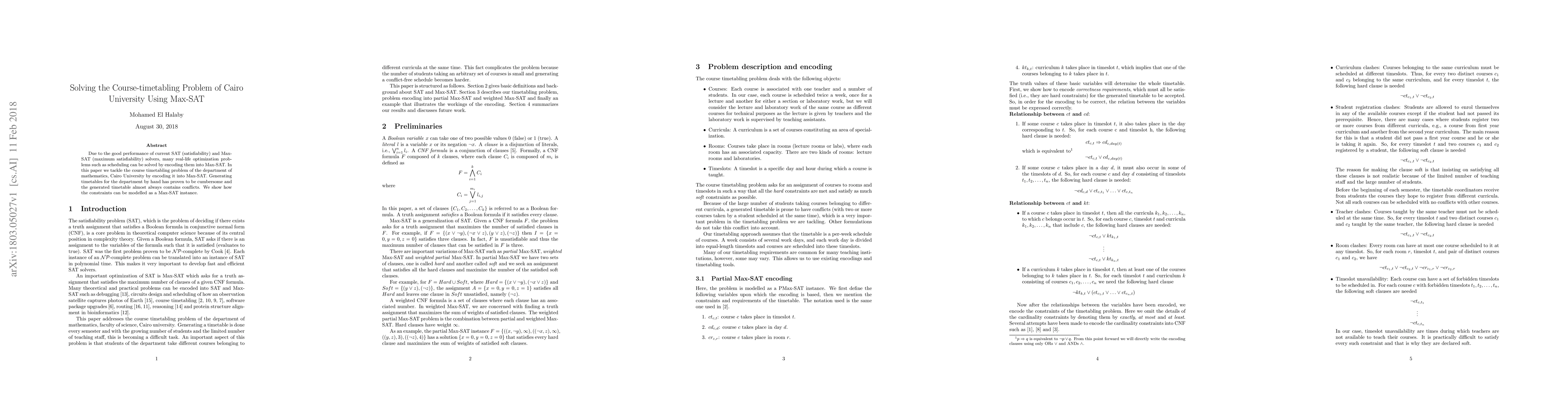 The research encodes the course timetabling problem of Cairo University's Mathematics Department into a Max-SAT instance, using current SAT and Max-SAT solvers for optimization.