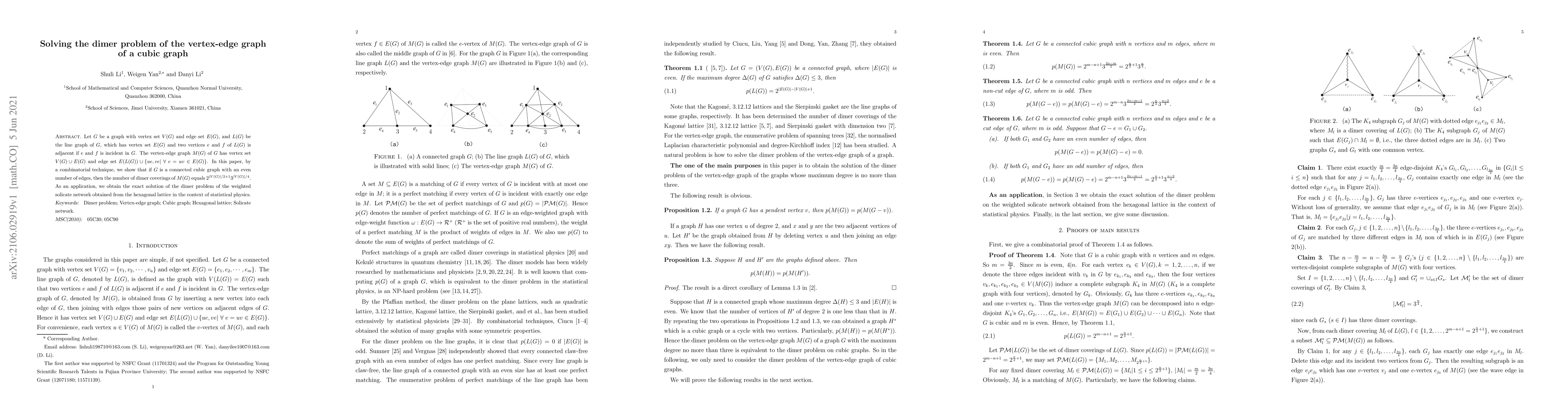 Let $G$ be a graph with vertex set $V(G)$ and edge set $E(G)$, and $L(G)$ be the line graph of $G$, which has vertex set $E(G)$ and two vertices $e$ and $f$ of $L(G)$ is adjacent if $e$ and $f$ is incident in $G$. The vertex-edge graph $M(G)$ of $G$ has vertex set $V(G)\cup E(G)$ and edge set $E(L(G))\cup \{ue,ve|\ \forall\ e=uv\in E(G)\}$. In this paper, by a combinatorial technique, we show that if $G$ is a connected cubic graph with an even number of edges, then the number of dimer coverings of $M(G)$ equals $2^{|V(G)|/2+1}3^{|V(G)|/4}$. As an application, we obtain the exact solution of the dimer problem of the weighted solicate network obtained from the hexagonal lattice in the context of statistical physics.