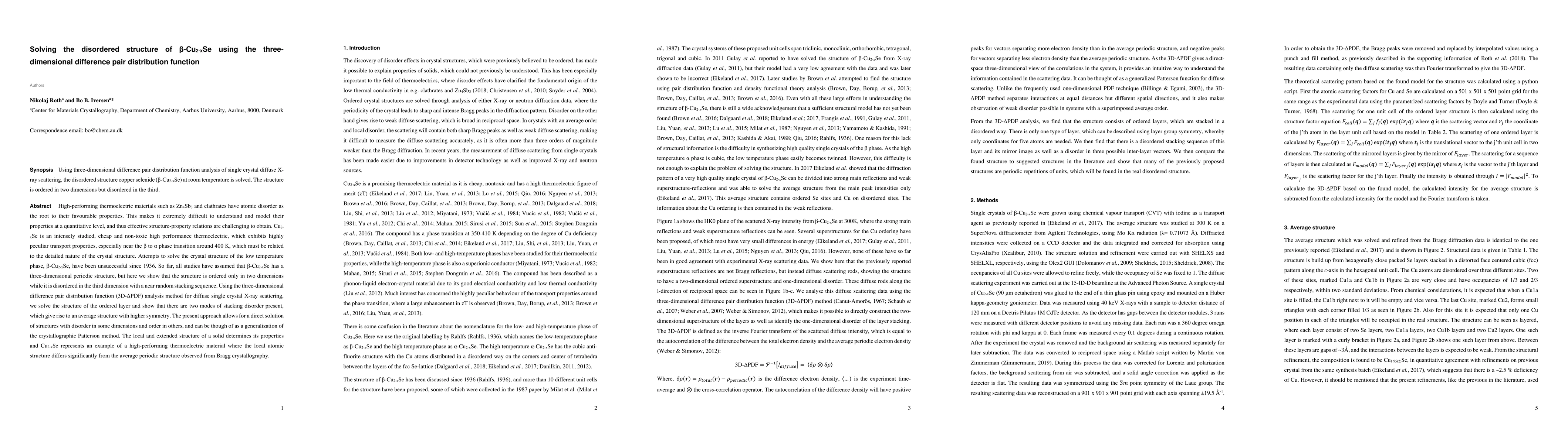 This paper solves the long-standing structural problem of $\beta$-Cu$_{2-x}$Se using 3D-$\Delta$PDF analysis, revealing a two-dimensional ordered structure with significant three-dimensional disorder. This approach provides insights into the material's thermoelectric properties, highlighting the importance of local atomic structure over periodic average structures.