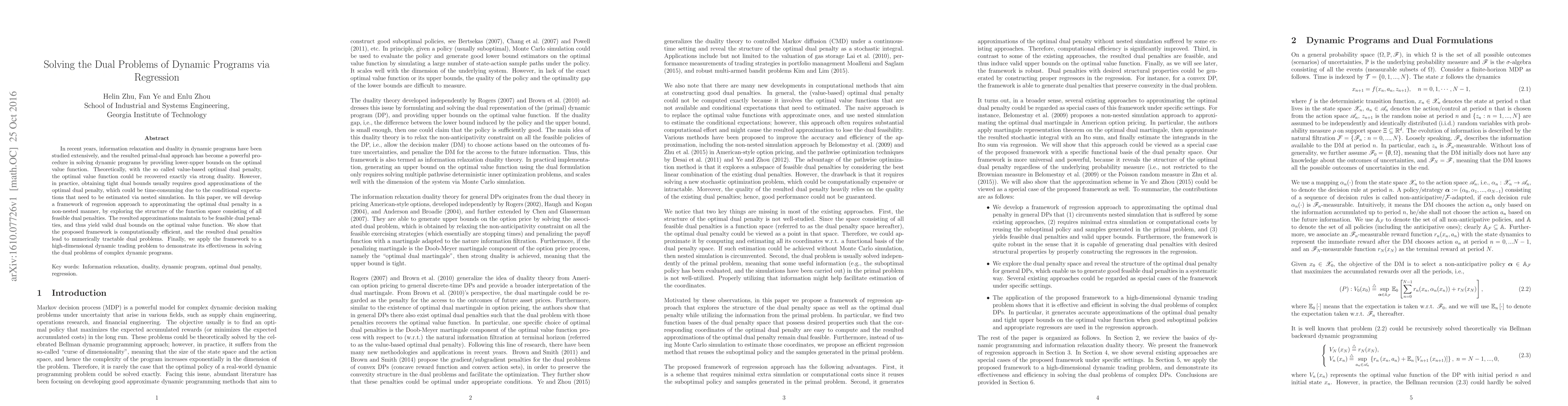 In recent years, information relaxation and duality in dynamic programs have been studied extensively, and the resulted primal-dual approach has become a powerful procedure in solving dynamic programs by providing lower-upper bounds on the optimal value function. Theoretically, with the so called value-based optimal dual penalty, the optimal value function could be recovered exactly via strong duality. However, in practice, obtaining tight dual bounds usually requires good approximations of the optimal dual penalty, which could be time-consuming due to the conditional expectations that need to be estimated via nested simulation. In this paper, we will develop a framework of regression approach to approximating the optimal dual penalty in a non-nested manner, by exploring the structure of the function space consisting of all feasible dual penalties. The resulted approximations maintain to be feasible dual penalties, and thus yield valid dual bounds on the optimal value function. We show that the proposed framework is computationally efficient, and the resulted dual penalties lead to numerically tractable dual problems. Finally, we apply the framework to a high-dimensional dynamic trading problem to demonstrate its effectiveness in solving the dual problems of complex dynamic programs.