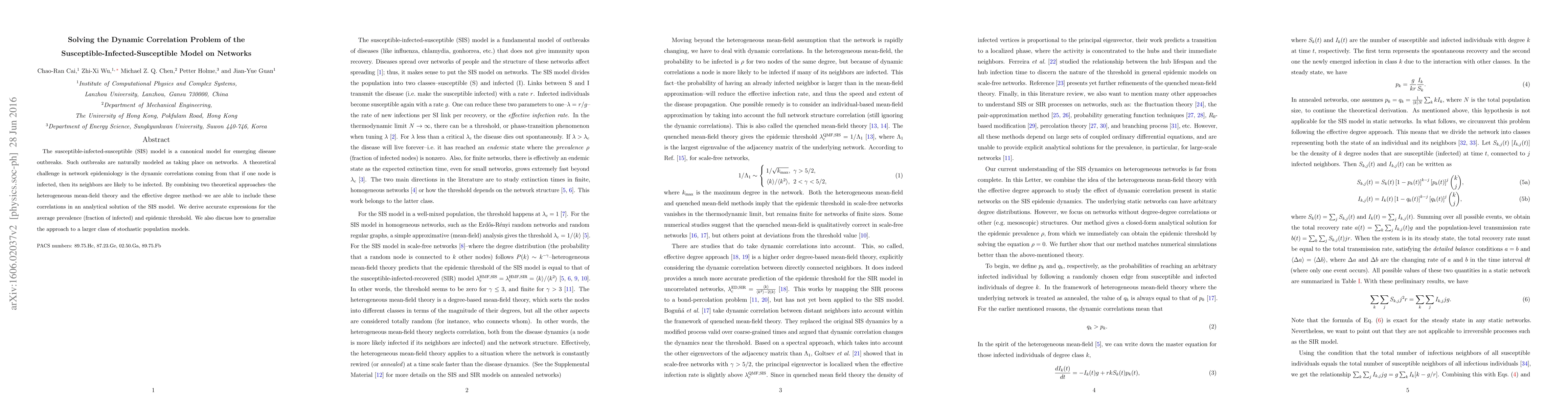 This paper addresses the dynamic correlation issue in the Susceptible-Infected-Susceptible (SIS) model on networks using heterogeneous mean-field theory and the effective degree method. It provides analytical solutions for average prevalence and epidemic threshold, and explores the generalization to broader stochastic models.