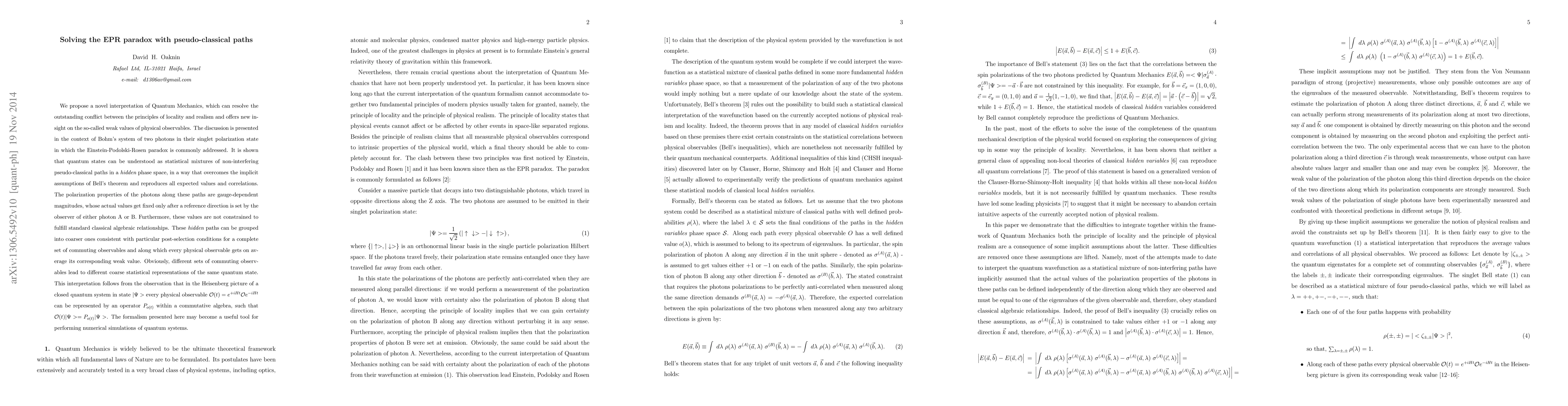 We propose a novel interpretation of Quantum Mechanics, which can resolve the outstanding conflict between the principles of locality and realism and offers new insight on the so-called weak values of physical observables. The discussion is presented in the context of Bohm's system of two photons in their singlet polarization state in which the Einstein-Podolski-Rosen paradox is commonly addressed. It is shown that quantum states can be understood as statistical mixtures of non-interfering pseudo-classical paths in a {\it hidden} phase space, in a way that overcomes the implicit assumptions of Bell's theorem and reproduces all expected values and correlations. The polarization properties of the photons along these paths are gauge-dependent magnitudes, whose actual values get fixed only after a reference direction is set by the observer of either photon A or B. Furthermore, these values are not constrained to fulfill standard classical algebraic relationships. These {\it hidden} paths can be grouped into coarser ones consistent with particular post-selection conditions for a complete set of commuting observables and along which every physical observable gets on average its corresponding weak value. Obviously, different sets of commuting observables lead to different coarse statistical representations of the same quantum state. This interpretation follows from the observation that in the Heisenberg picture of a closed quantum system in state $|\Psi>$ every physical observable ${\cal O}(t)=e^{+i H t} {\cal O} e^{-i H t}$ can be represented by an operator $P_{o(t)}$ within a commutative algebra, such that ${\cal O}(t)|\Psi>=P_{o(t)}|\Psi>$. The formalism presented here may become a useful tool for performing numerical simulations of quantum systems.