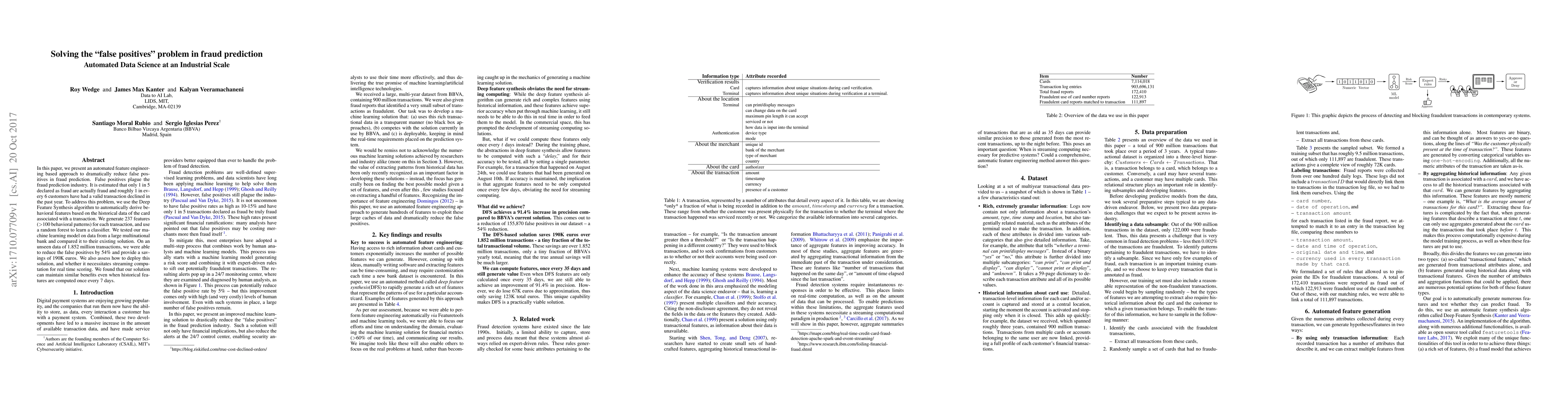 This paper introduces an automated feature engineering method using Deep Feature Synthesis to reduce false positives in fraud prediction, achieving a 54% reduction and saving €190K for a multinational bank. The approach generates 237 behavioral features and employs a random forest classifier, demonstrating effectiveness even with periodic feature updates.