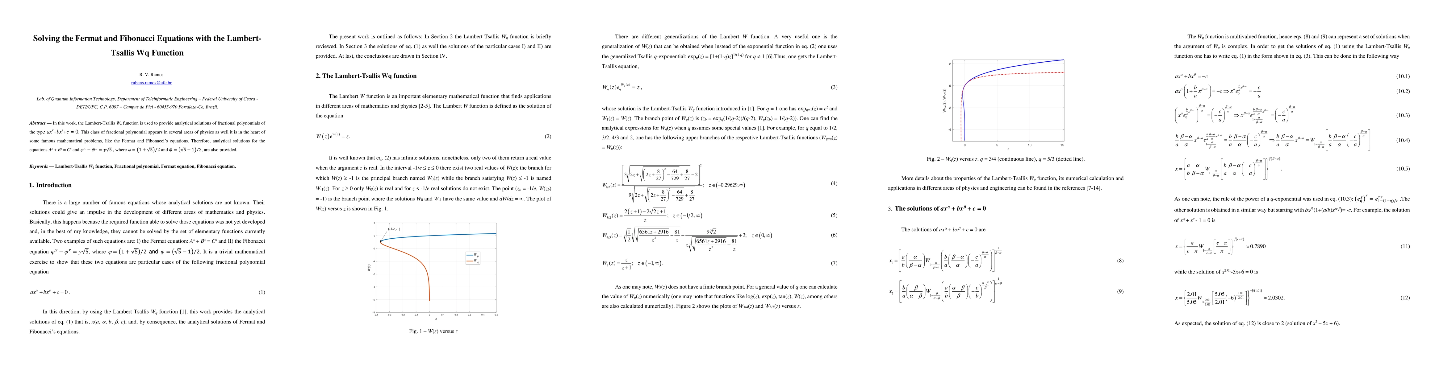 This paper utilizes the Lambert-Tsallis Wq function to derive analytical solutions for fractional polynomials and applies this method to solve the Fermat and Fibonacci equations, providing new insights into these classic mathematical problems.