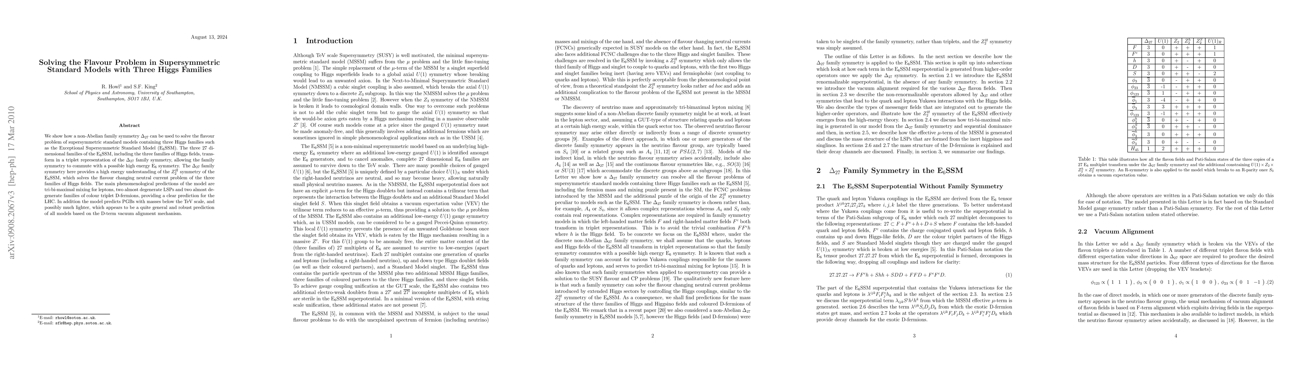 We show how a non-Abelian family symmetry Delta(27) can be used to solve the flavour problem of supersymmetric standard models containing three Higgs families such as the Exceptional Supersymmetric Standard Model (E(6)SSM). The three 27 dimensional families of the E(6)SSM, including the three families of Higgs fields, transform in a triplet representation of the Delta(27) family symmetry, allowing the family symmetry to commute with a possible high energy E(6) symmetry. The Delta(27) family symmetry here provides a high energy understanding of the Z(2)H symmetry of the E(6)SSM, which solves the flavour changing neutral current problem of the three families of Higgs fields. The main phenomenological predictions of the model are tri-bi-maximal mixing for leptons, two almost degenerate LSPs and two almost degenerate families of colour triplet D-fermions, providing a clear prediction for the LHC. In addition the model predicts PGBs with masses below the TeV scale, and possibly much lighter, which appears to be a quite general and robust prediction of all models based on the D-term vacuum alignment mechanism.