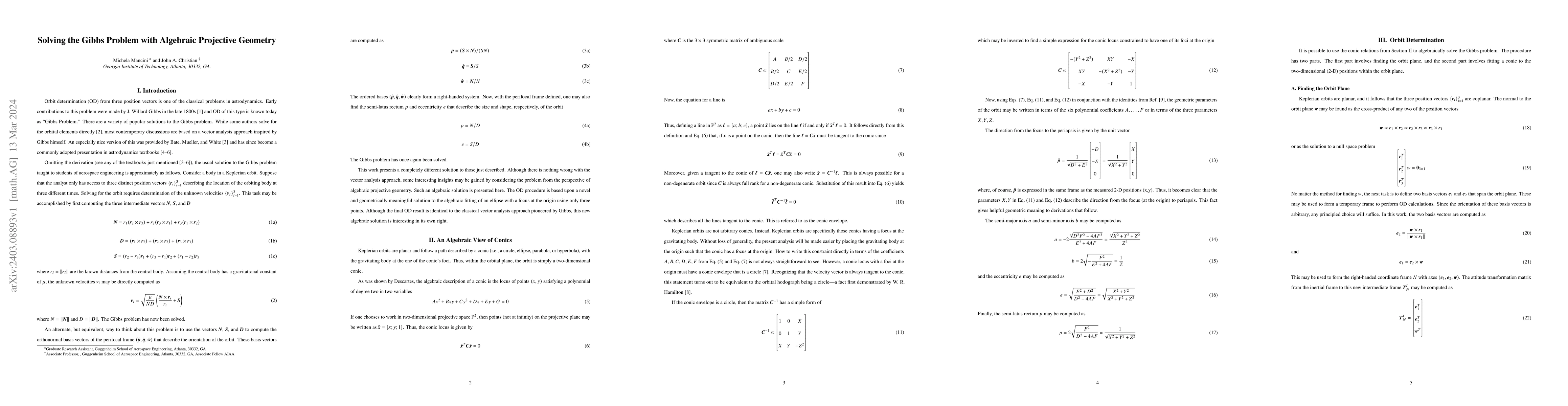 Orbit determination (OD) from three position vectors is one of the classical problems in astrodynamics. Early contributions to this problem were made by J. Willard Gibbs in the late 1800s and OD of this type is known today as ``Gibbs Problem''. There are a variety of popular solutions to the Gibbs problem. While some authors solve for the orbital elements directly, most contemporary discussions are based on a vector analysis approach inspired by Gibbs himself. This work presents a completely different solution to those just described. Although there is nothing wrong with the vector analysis approach, some interesting insights may be gained by considering the problem from the perspective of algebraic projective geometry. Such an algebraic solution is presented here. The OD procedure is based upon a novel and geometrically meaningful solution to the algebraic fitting of an ellipse with a focus at the origin using only three points. Although the final OD result is identical to the classical vector analysis approach pioneered by Gibbs, this new algebraic solution is interesting in its own right.