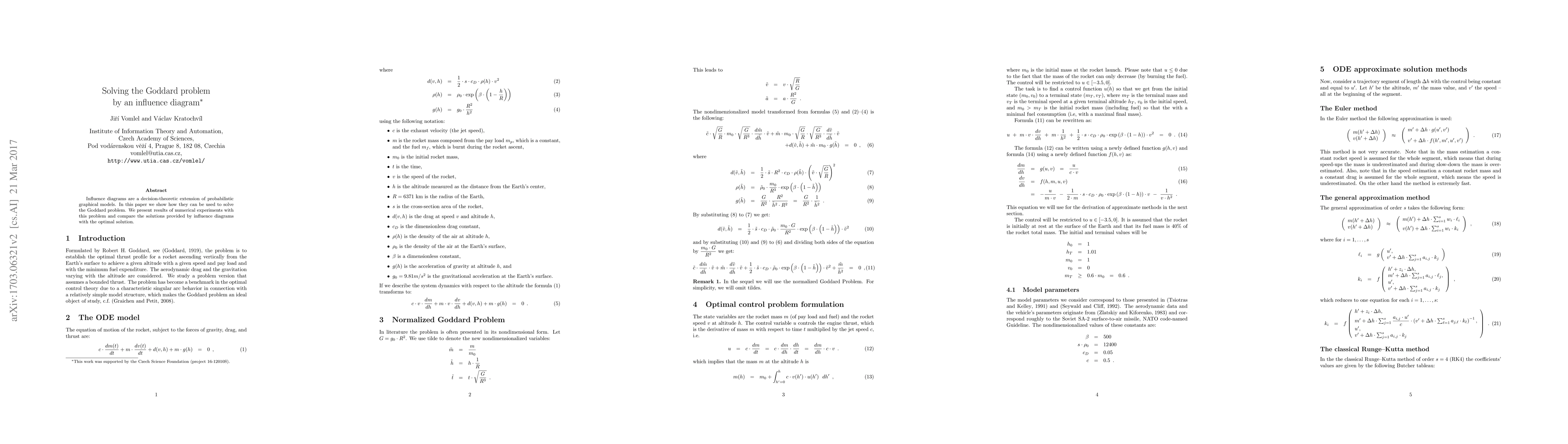 Influence diagrams are a decision-theoretic extension of probabilistic graphical models. In this paper we show how they can be used to solve the Goddard problem. We present results of numerical experiments with this problem and compare the solutions provided by influence diagrams with the optimal solution.