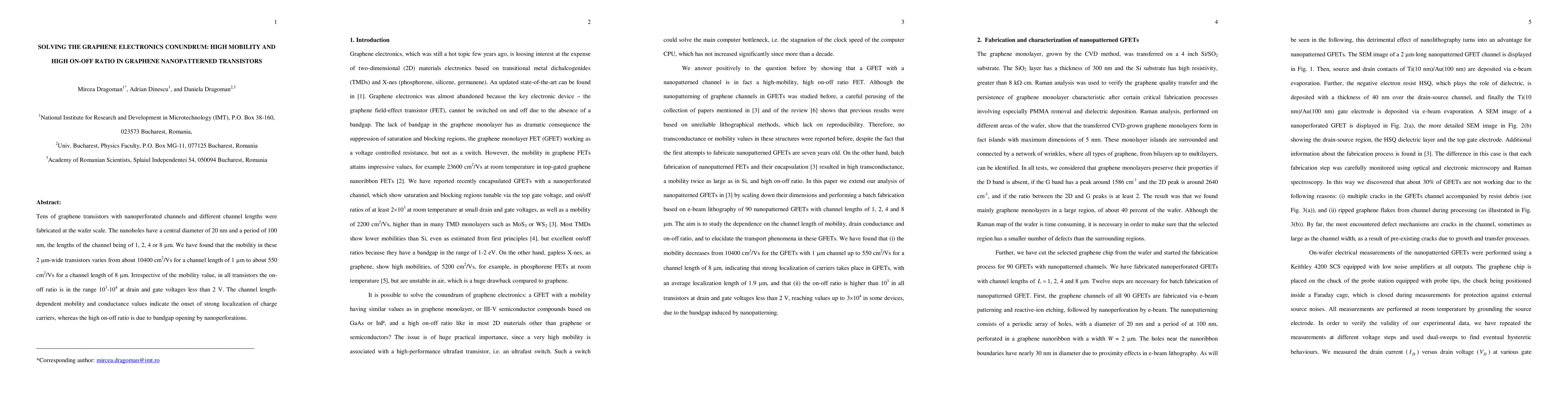 Tens of graphene transistors with nanoperforated channels and different channel lengths were fabricated at the wafer scale. The nanoholes have a central diameter of 20 nm and a period of 100 nm, the lengths of the channel being of 1, 2, 4 or 8 micrometers. We have found that the mobility in these 2 micrometer-wide transistors varies from about 10400 cm2/Vs for a channel length of 1 micrometer to about 550 cm2/Vs for a channel length of 8 micrometer. Irrespective of the mobility value, in all transistors the on-off ratio is in the range 10^3-10^4 at drain and gate voltages less than 2 V. The channel length-dependent mobility and conductance values indicate the onset of strong localization of charge carriers, whereas the high on-off ratio is due to bandgap opening by nanoperforations.