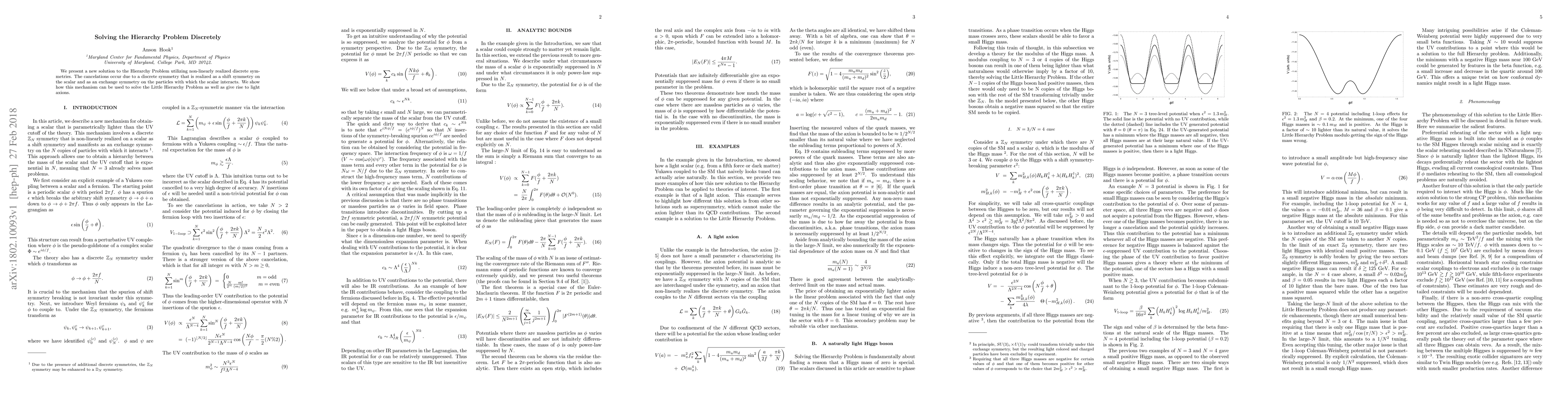 This paper proposes a novel solution to the Hierarchy Problem through non-linearly realized discrete symmetries, demonstrating cancelations via a shift symmetry on scalars and an exchange symmetry on interacting particles. It also addresses the Little Hierarchy Problem and predicts the existence of light axions.