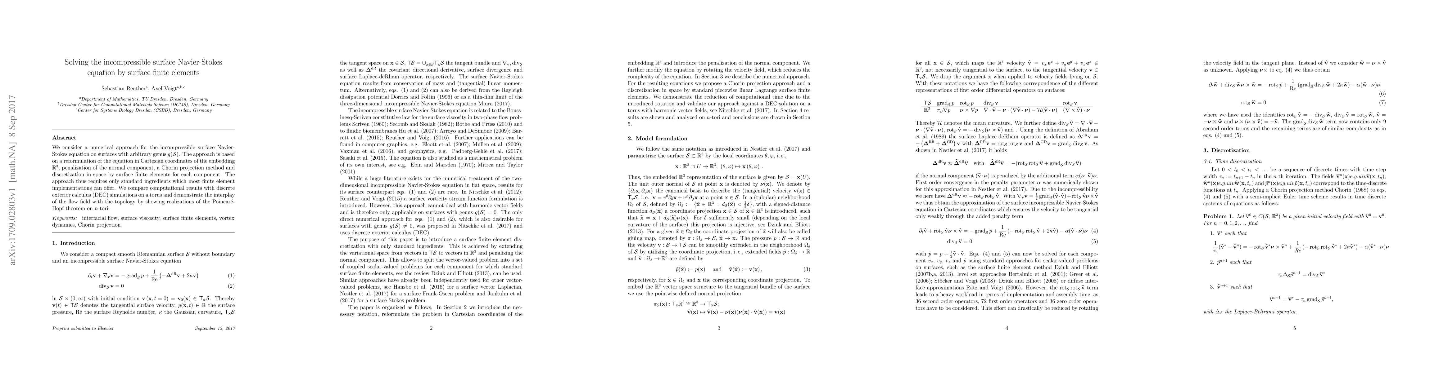 Researchers developed a numerical approach to solve the incompressible surface Navier-Stokes equation using surface finite elements, comparing results with discrete exterior calculus simulations on a torus.
