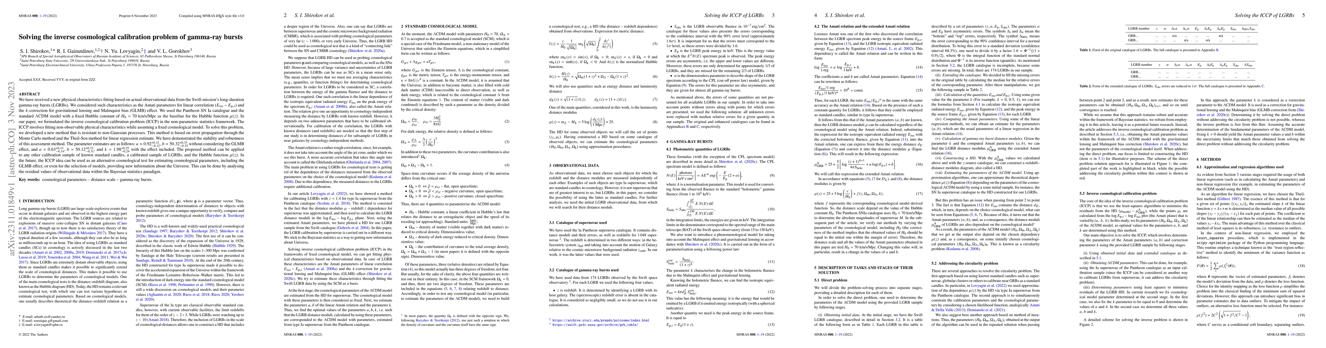 This paper presents a new method to solve the inverse cosmological calibration problem using gamma-ray bursts (LGRBs) from the Swift mission, incorporating Amati parameters and the $k$-correction for gravitational lensing and Malmquist bias. The method, based on Monte Carlo error propagation and Theil-Sen regression, provides robust parameter estimates and can serve as an alternative cosmological test.