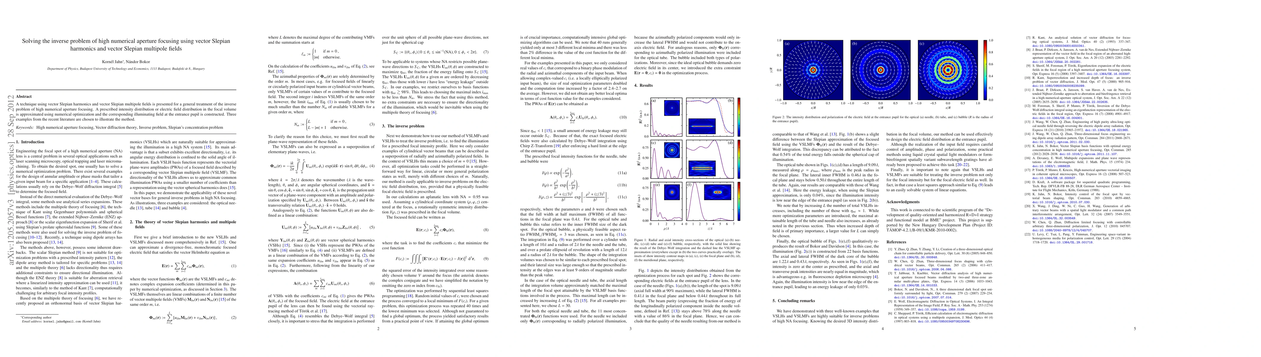 A technique using vector Slepian harmonics and multipole fields is presented for a general treatment of the inverse problem of high numerical aperture focusing. A prescribed intensity distribution or electric field distribution in the focal volume is approximated using numerical optimization and the corresponding illuminating field at the entrance pupil is constructed. Three examples from the recent literature have been chosen to illustrate the method.