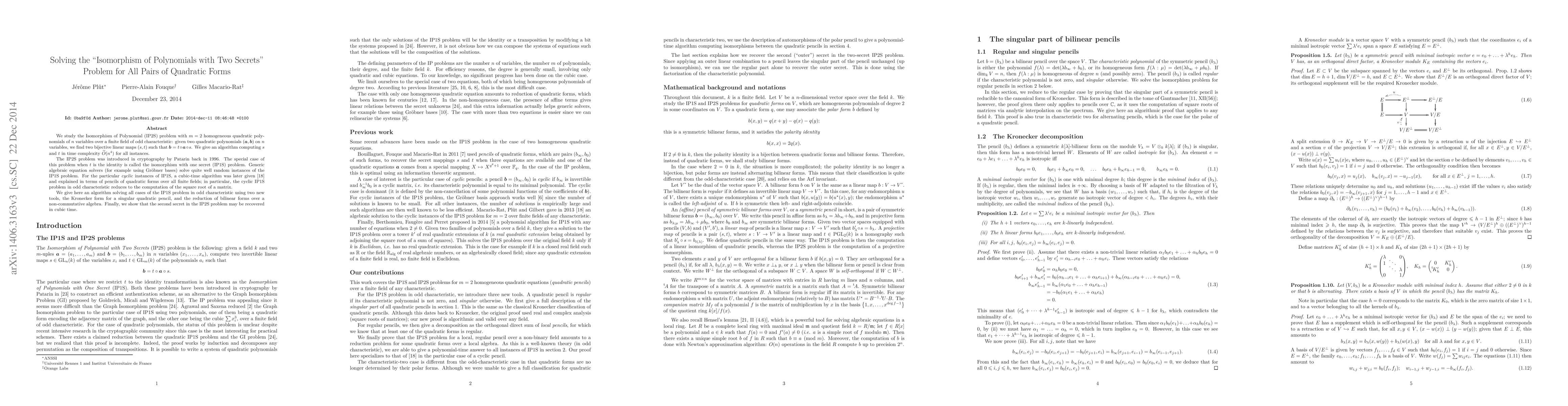 We study the Isomorphism of Polynomial (IP2S) problem with m=2 homogeneous quadratic polynomials of n variables over a finite field of odd characteristic: given two quadratic polynomials (a, b) on n variables, we find two bijective linear maps (s,t) such that b=t . a . s. We give an algorithm computing s and t in time complexity O~(n^4) for all instances, and O~(n^3) in a dominant set of instances. The IP2S problem was introduced in cryptography by Patarin back in 1996. The special case of this problem when t is the identity is called the isomorphism with one secret (IP1S) problem. Generic algebraic equation solvers (for example using Gr\"obner bases) solve quite well random instances of the IP1S problem. For the particular cyclic instances of IP1S, a cubic-time algorithm was later given and explained in terms of pencils of quadratic forms over all finite fields; in particular, the cyclic IP1S problem in odd characteristic reduces to the computation of the square root of a matrix. We give here an algorithm solving all cases of the IP1S problem in odd characteristic using two new tools, the Kronecker form for a singular quadratic pencil, and the reduction of bilinear forms over a non-commutative algebra. Finally, we show that the second secret in the IP2S problem may be recovered in cubic time.