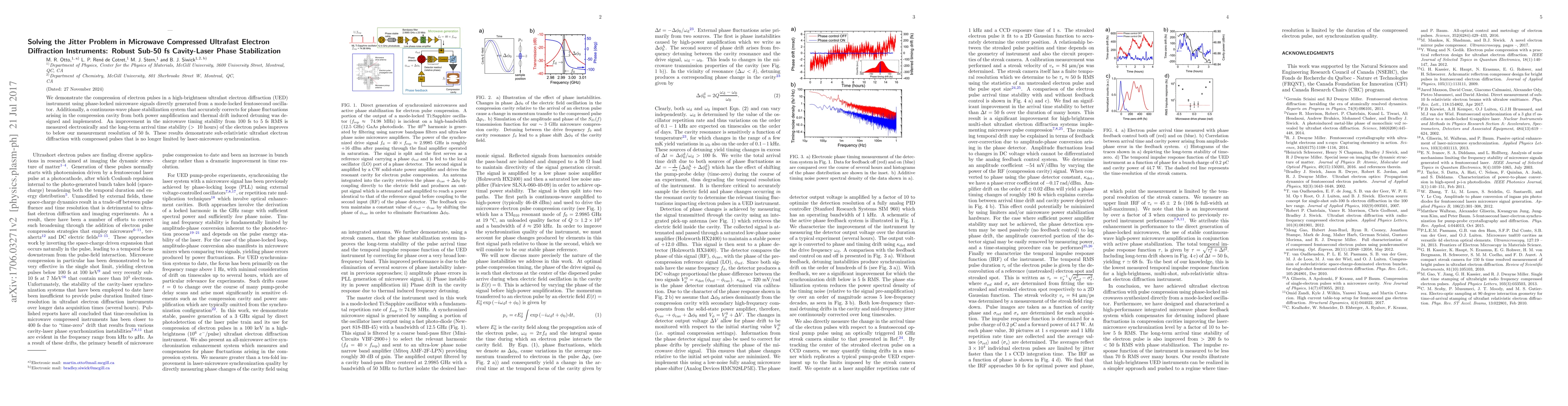 This paper presents a method for compressing electron pulses in ultrafast electron diffraction instruments using phase-locked microwave signals, achieving sub-50 fs timing stability. A continuous-wave phase stabilization system effectively corrects for phase fluctuations, improving the long-term arrival time stability of electron pulses to below 50 fs.