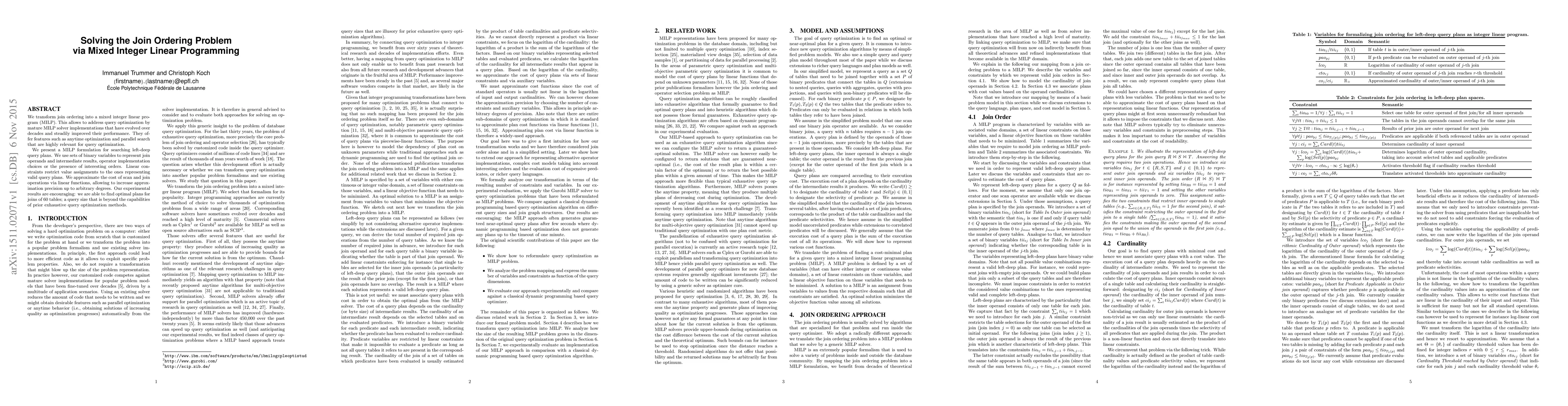 Researchers developed a mixed integer linear program to optimize query plans in databases, successfully solving complex join operations for 60 tables.