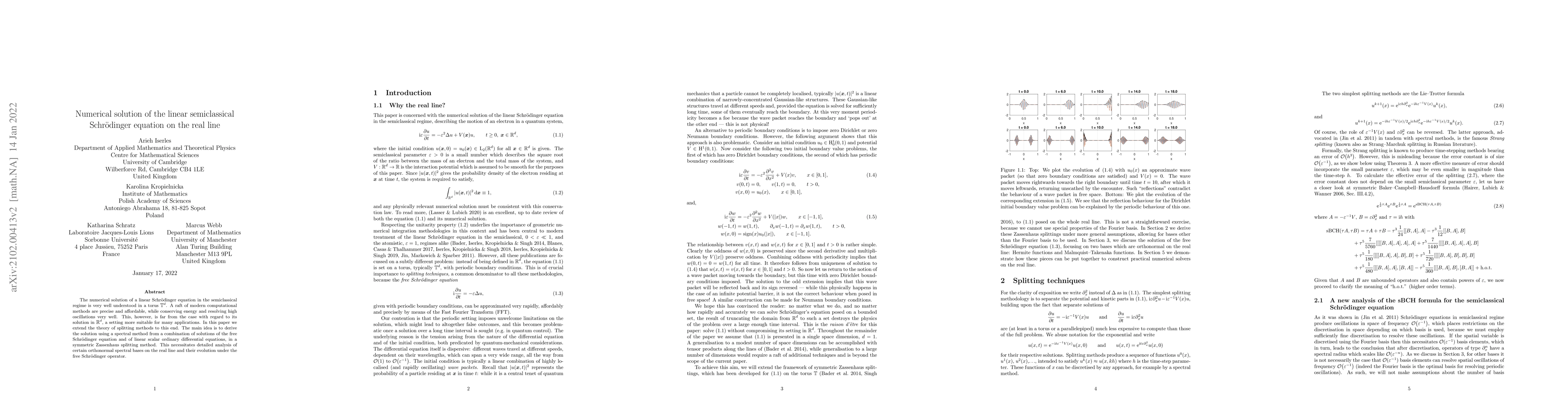 This paper extends splitting methods to solve the linear semiclassical Schrödinger equation on the real line, leveraging a spectral method combining solutions of the free Schrödinger equation and linear scalar ODEs in a symmetric Zassenhaus splitting. It focuses on analyzing orthonormal spectral bases on the real line and their evolution under the free Schrödinger operator.