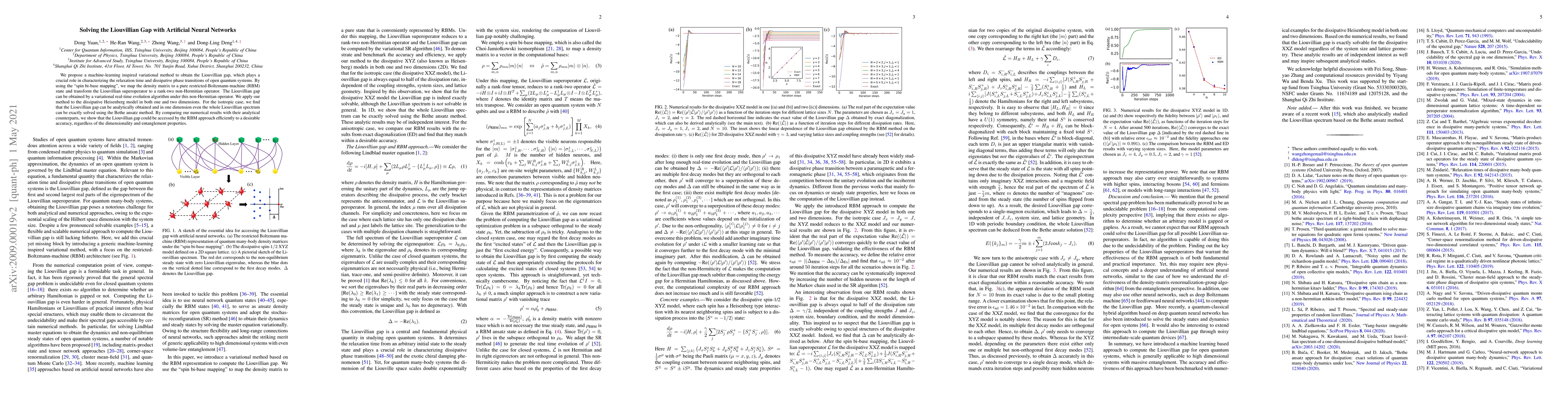 This paper introduces a machine-learning-inspired variational method using artificial neural networks to determine the Liouvillian gap, essential for understanding relaxation times and phase transitions in open quantum systems. The method employs a "spin bi-base mapping" and a restricted-Boltzmann machine to efficiently compute the gap, validated through comparisons with analytical results for the dissipative Heisenberg model.