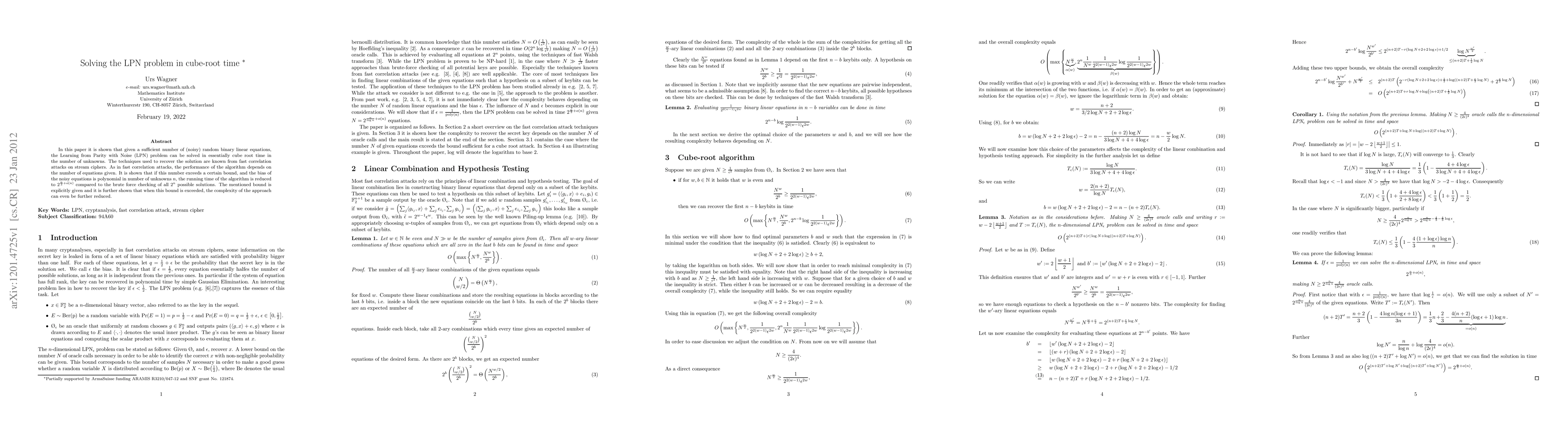 In this paper it is shown that given a sufficient number of (noisy) random binary linear equations, the Learning from Parity with Noise (LPN) problem can be solved in essentially cube root time in the number of unknowns. The techniques used to recover the solution are known from fast correlation attacks on stream ciphers. As in fast correlation attacks, the performance of the algorithm depends on the number of equations given. It is shown that if this number exceeds a certain bound, and the bias of the noisy equations is polynomial in number of unknowns, the running time of the algorithm is reduced to almost cube root time compared to the brute force checking of all possible solutions. The mentioned bound is explicitly given and it is further shown that when this bound is exceeded, the complexity of the approach can even be further reduced.
