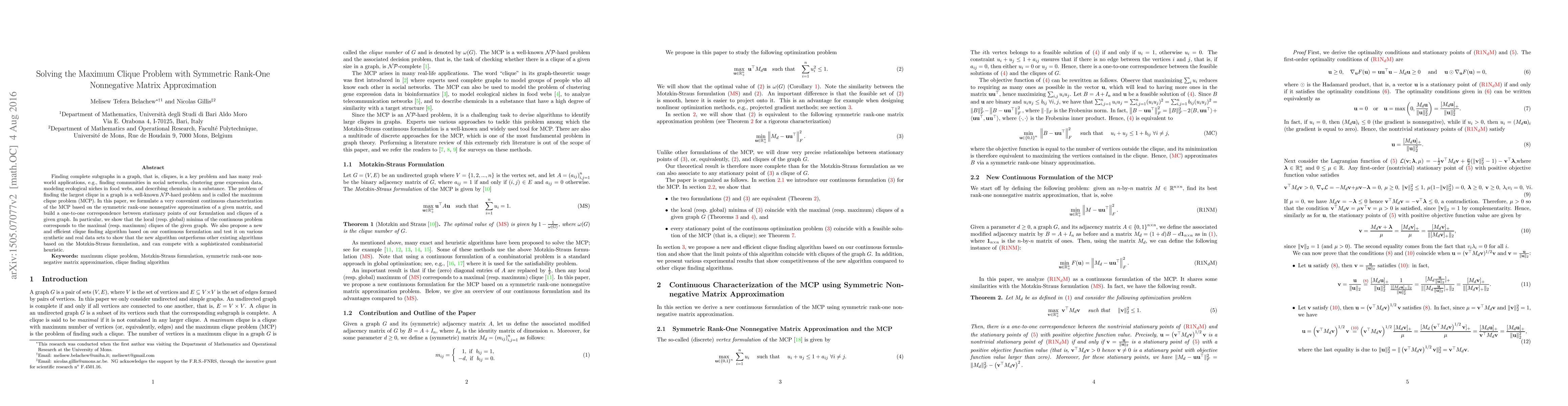 This paper proposes a continuous characterization of the maximum clique problem using symmetric rank-one nonnegative matrix approximation, establishing a correspondence between stationary points and graph cliques. It introduces a new efficient algorithm that outperforms existing methods and is competitive with sophisticated heuristics.