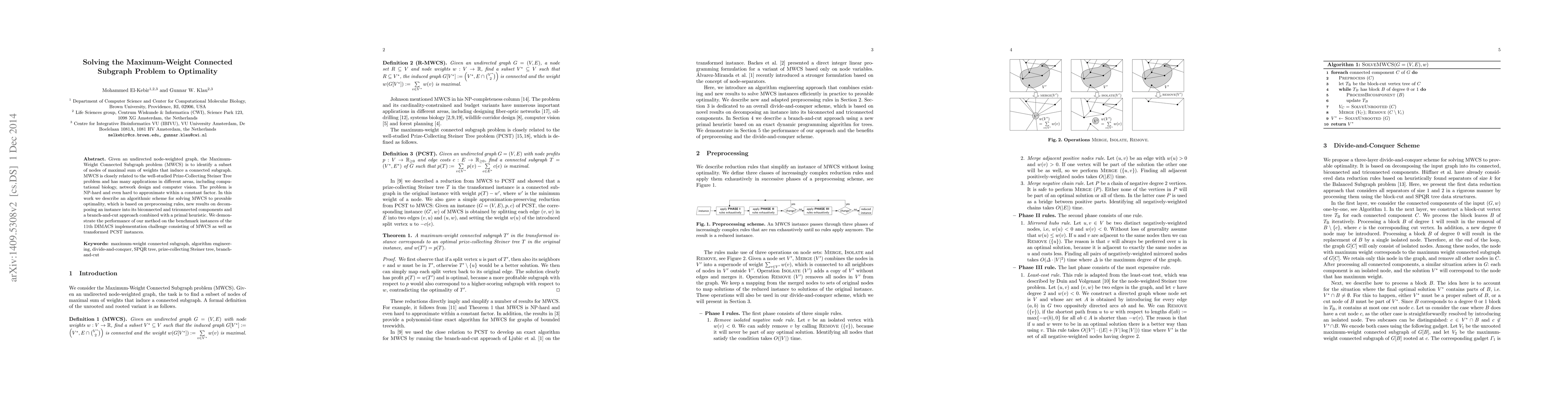 A new algorithmic scheme solves the Maximum-Weight Connected Subgraph problem with proven optimality, utilizing preprocessing rules, decomposition techniques, and a branch-and-cut approach.