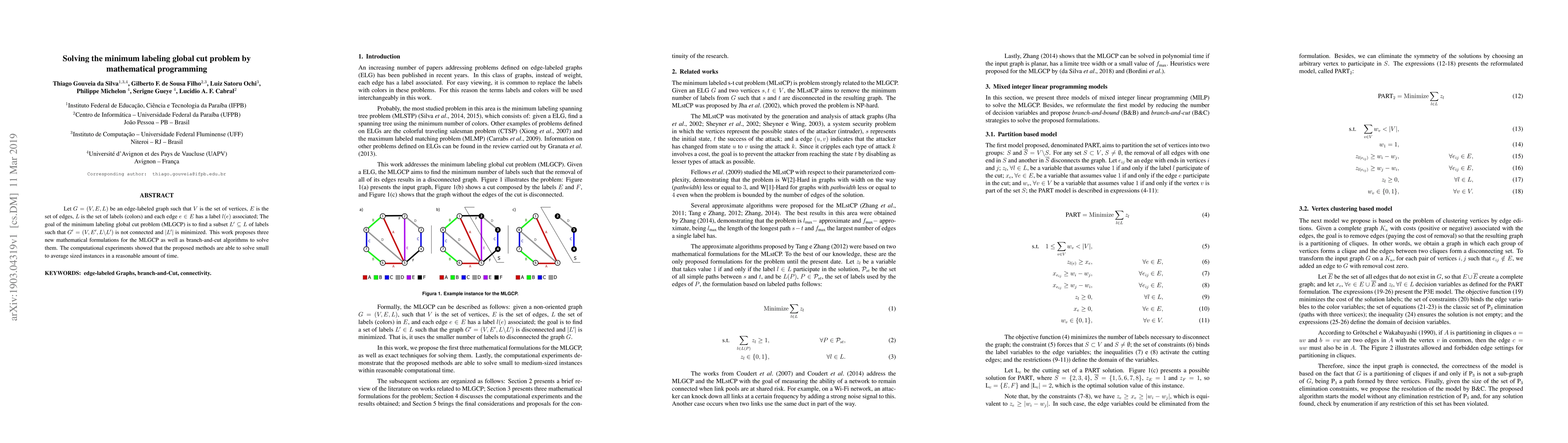 Let G = (V, E, L) be an edge-labeled graph such that V is the set of vertices, E is the set of edges, L is the set of labels (colors) and each edge e \in E has a label l(e) associated; The goal of the minimum labeling global cut problem (MLGCP) is to find a subset L \subseteq L of labels such that G = (V, E , L\L ) is not connected and |L| is minimized. This work proposes three new mathematical formulations for the MLGCP as well as branch-and-cut algorithms to solve them. The computational experiments showed that the proposed methods are able to solve small to average sized instances in a reasonable amount of time.
