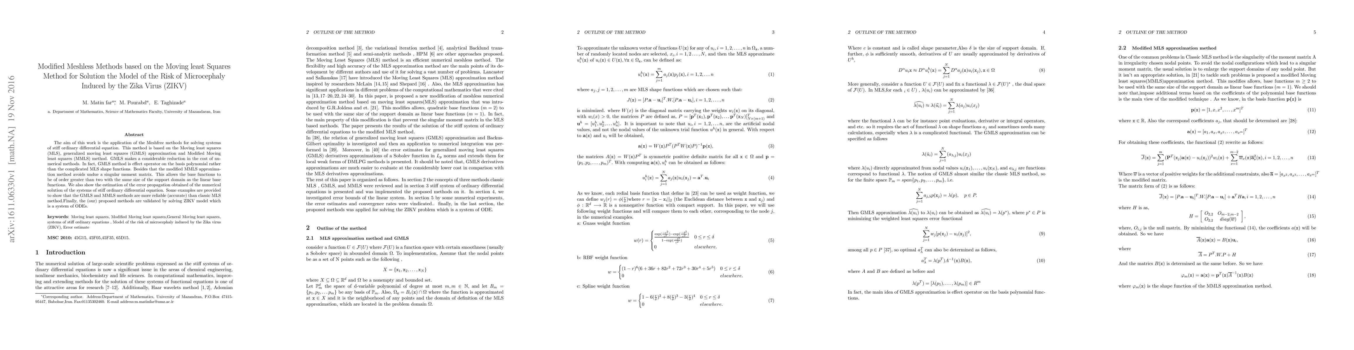 The aim of this work is the application of the Meshfree methods for solving systems of stiff ordinary differential equations. These methods are based on the Moving least squares (MLS), generalized moving least squares (GMLS) approximation and Modified Moving least squares (MMLS) method. GMLS makes a considerable reduction in the cost of numerical methods. In fact, GMLS method is effect operator on the basis polynomial rather than the complicated MLS shape functions. Besides that the modified MMLS approximation method avoids undue a singular moment matrix. This allows the base functions to be of order greater than two with the same size of the support domain as the linear base functions. We also show the estimation of the error propagation obtained of the numerical solution of the systems of stiff ordinary differential equation. Some examples are provided to show that the GMLS and MMLS methods are more reliable (accurate) than classic MLS method.Finally, the (our) proposed methods are validated by solving ZIKV model which is a system of ODEs.