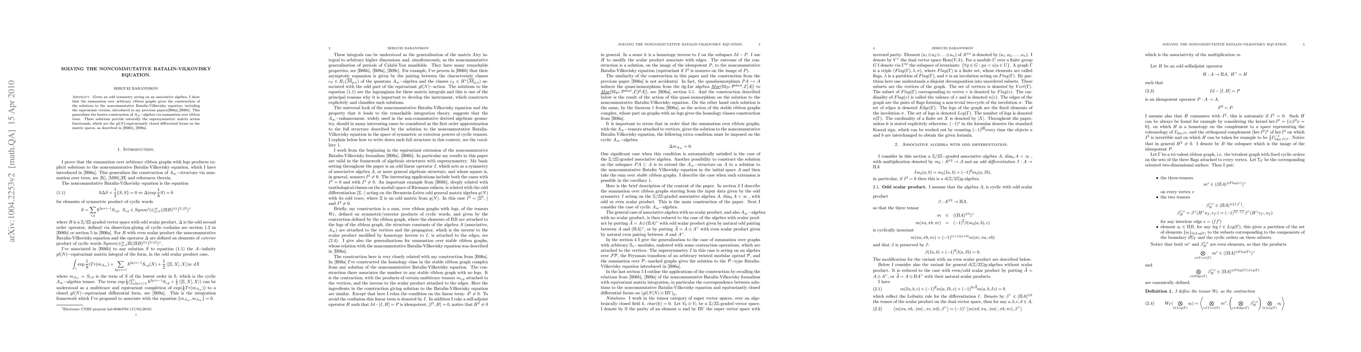 The paper provides a new method to solve the noncommutative Batalin-Vilkovisky equation using summation over ribbon graphs with legs, generalizing the known construction of A-infinity algebra.