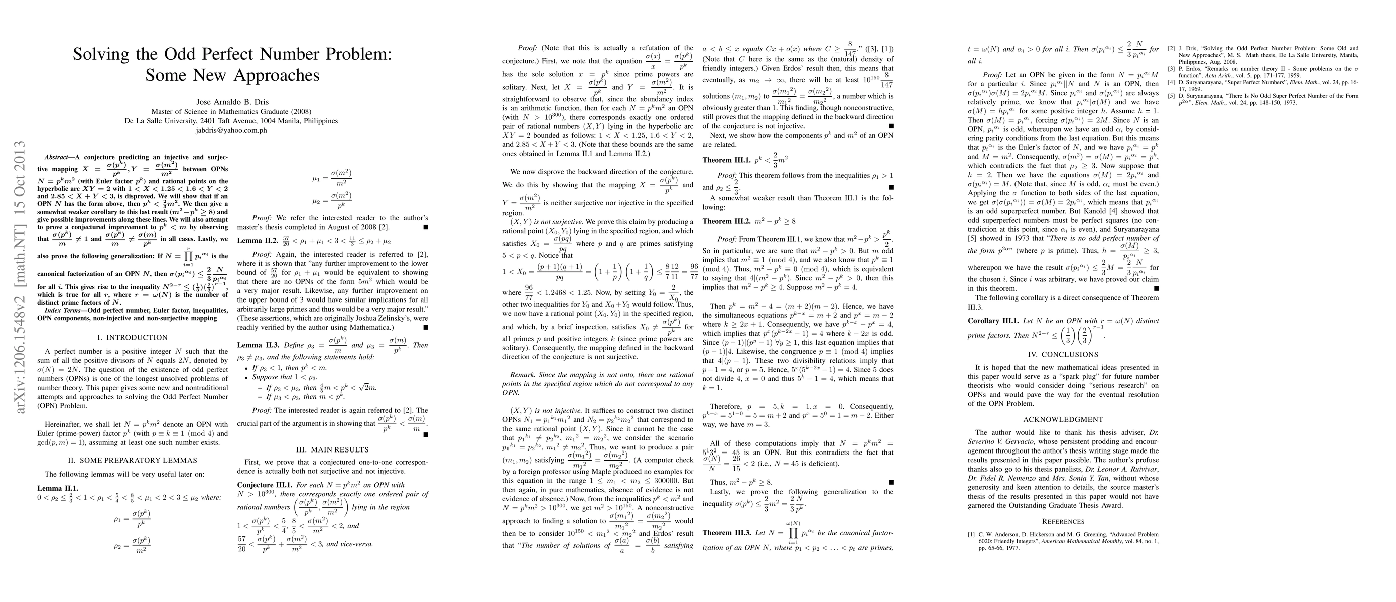 A conjecture predicting an injective and surjective mapping $X = \displaystyle\frac{\sigma(p^k)}{p^k}, Y = \displaystyle\frac{\sigma(m^2)}{m^2}$ between OPNs $N = {p^k}{m^2}$ (with Euler factor $p^k$) and rational points on the hyperbolic arc $XY = 2$ with $1 < X < 1.25 < 1.6 < Y < 2$ and $2.85 < X + Y < 3$, is disproved. We will show that if an OPN $N$ has the form above, then $p^k < {2/3}{m^2}$. We then give a somewhat weaker corollary to this last result ($m^2 - p^k \ge 8$) and give possible improvements along these lines. We will also attempt to prove a conjectured improvement to $p^k < m$ by observing that $\displaystyle\frac{\sigma(p^k)}{m} \ne 1$ and $\displaystyle\frac{\sigma(p^k)}{m} \ne \displaystyle\frac{\sigma(m)}{p^k}$ in all cases. Lastly, we also prove the following generalization: If $N = \displaystyle\prod_{i = 1}^{r}{{p_i}^{\alpha_i}}$ is the canonical factorization of an OPN $N$, then $\displaystyle\sigma({p_i}^{\alpha_i}) \le \displaystyle(2/3)\displaystyle\frac{N}{{p_i}^{\alpha_i}}$ for all $i$. This gives rise to the inequality $N^{2 - r} \le (1/3){(2/3)}^{r - 1}$, which is true for all $r$, where $r = \omega(N)$ is the number of distinct prime factors of $N$.
