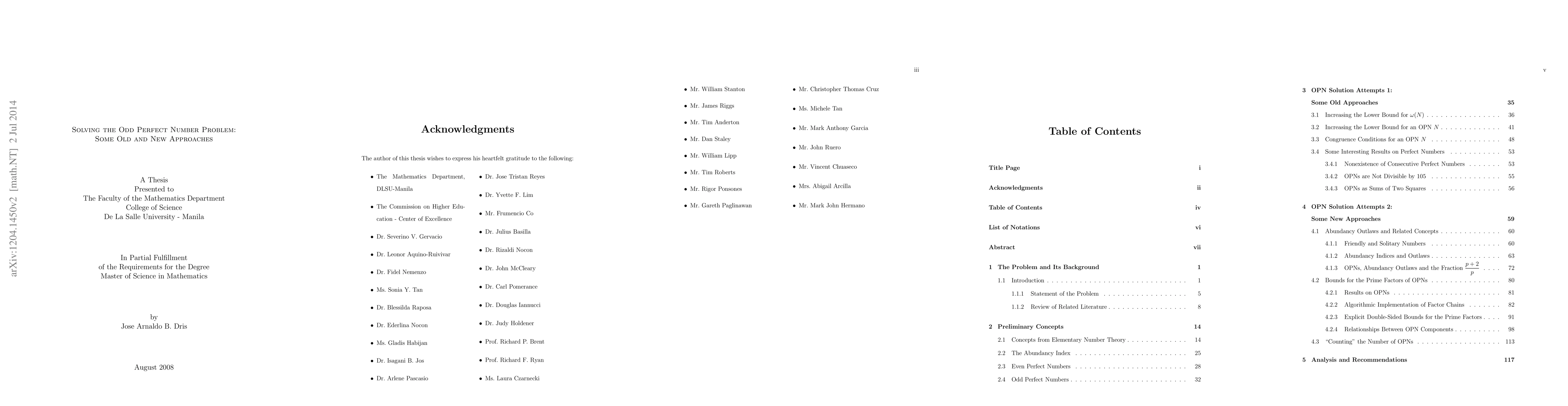 A perfect number is a positive integer $N$ such that the sum of all the positive divisors of $N$ equals $2N$, denoted by $\sigma(N) = 2N$. The question of the existence of odd perfect numbers (OPNs) is one of the longest unsolved problems of number theory. This thesis presents some of the old as well as new approaches to solving the OPN Problem. In particular, a conjecture predicting an injective and surjective mapping $X = \sigma(p^k)/p^k, Y = \sigma(m^2)/m^2$ between OPNs $N = {p^k}{m^2}$ (with Euler factor $p^k$) and rational points on the hyperbolic arc $XY = 2$ with $1 < X < 1.25 < 1.6 < Y < 2$ and $2.85 < X + Y < 3$, is disproved. Various results on the abundancy index and solitary numbers are used in the disproof. Numerical evidence against the said conjecture will likewise be discussed. We will show that if an OPN $N$ has the form above, then $p^k < (2/3){m^2}$ follows from \cite{D10}. We will also attempt to prove a conjectured improvement of this last result to $p^k < m$ by observing that $\sigma(p^k)/m \neq 1$ and $\sigma(p^k)/m \neq \sigma(m)/p^k$ in all cases. Lastly, we also prove the following generalization: If $N = \displaystyle\prod_{i=1}^r {{p_i}^{{\alpha}_i}}$ is the canonical factorization of an OPN $N$, then $$\sigma({p_i}^{{\alpha}_i}) \leq (2/3){\frac{N}{{p_i}^{{\alpha}_i}}}$$ for all $i$. This gives rise to the inequality $$N^{2 - r} \leq (1/3)(2/3)^{r - 1}$$ which is true for all $r$, where $r = \omega(N)$ is the number of distinct prime factors of $N$.