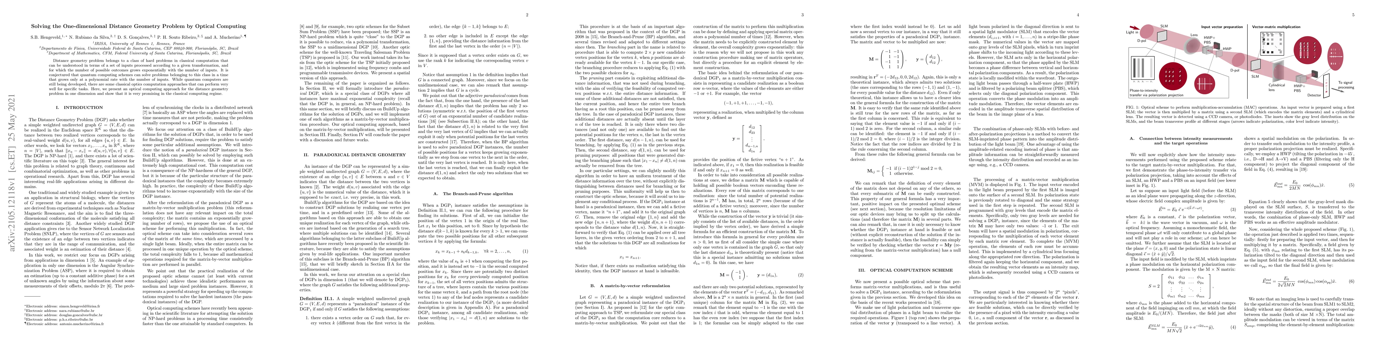Distance geometry problem belongs to a class of hard problems in classical computation that can be understood in terms of a set of inputs processed according to a given transformation, and for which the number of possible outcomes grows exponentially with the number of inputs. It is conjectured that quantum computing schemes can solve problems belonging to this class in a time that grows only at a polynomial rate with the number of inputs. While quantum computers are still being developed, there are some classical optics computation approaches that can perform very well for specific tasks. Here, we present an optical computing approach for the distance geometry problem in one dimension and show that it is very promising in the classical computing regime.