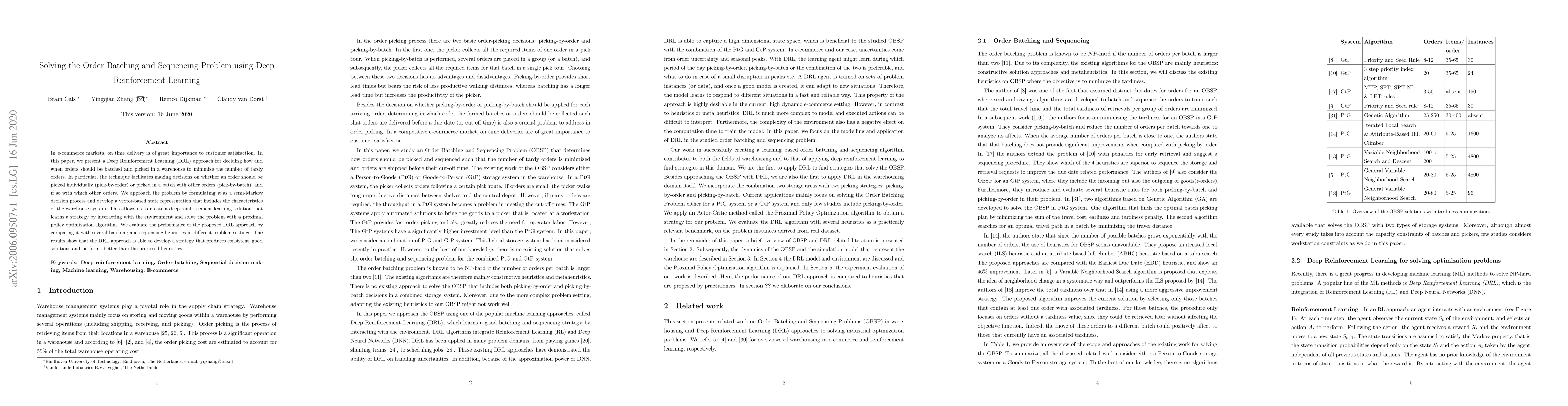 A Deep Reinforcement Learning approach is proposed to optimize order batching and sequencing in warehouses, achieving consistent good solutions and outperforming existing heuristics.